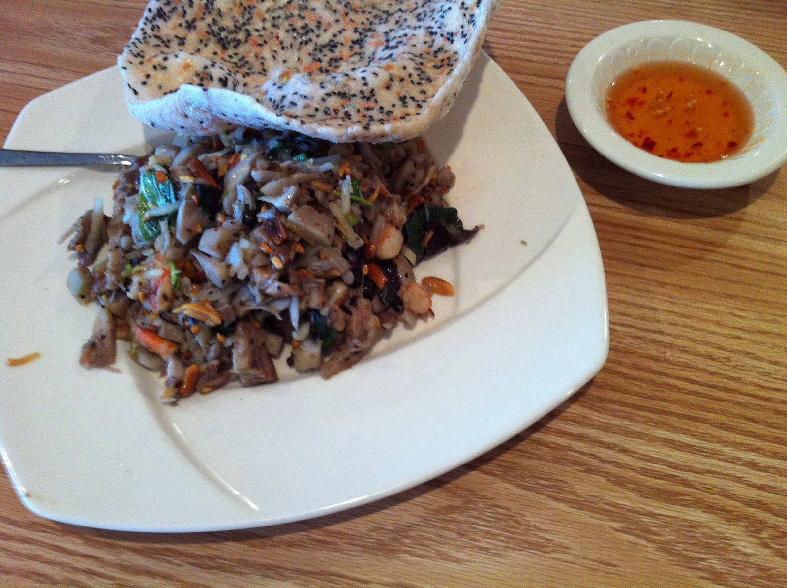 The pork and shrimp jackfruit salad arrived at the table topped with a sesame rice cracker.