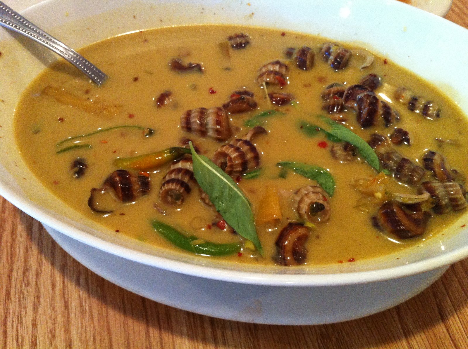 The seasoned periwinkle in coconut curry sauce was another great item. The periwinkles are cut on both ends, so you can easily suck the meat out and enjoy the sweet-spicy sauce. The herb on top is Vietnamese coriander (rau ram). There were about six of the little shelled creatures and some of the sauce left over and I brought those home to The Mister, who really enjoyed the flavors melded in this dish.