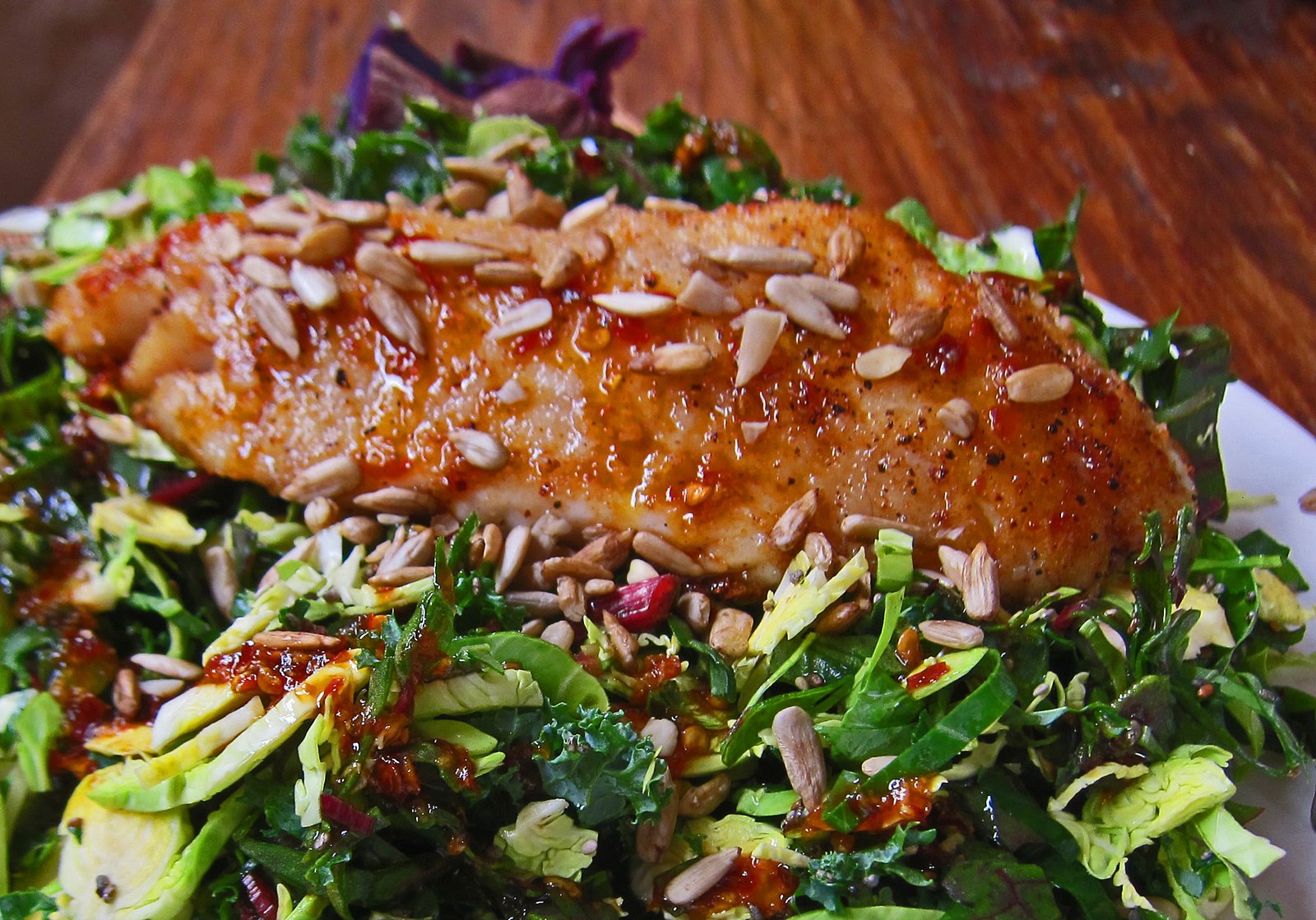 She placed the fish on top of a shaved chard, kale, brussel sprout salad. The dressing did quite well with the rather bitter salad….even I liked it. So maybe we've found a use for this "wing sauce", which actually wasn't too bad on wings either……