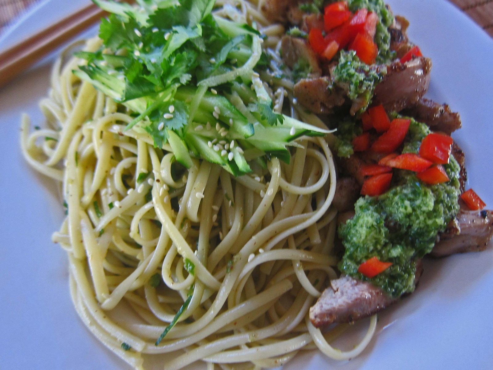 The sauce on the right is my ginger scallion pesto, which I made to compare…and I preferred more. It had more body, the garlic helped the sauce as well….I think hot peanut oil also brought out more flavor. So I dunno……if you look at the photo in the book, the sauce on David Chang's noodles is much darker.