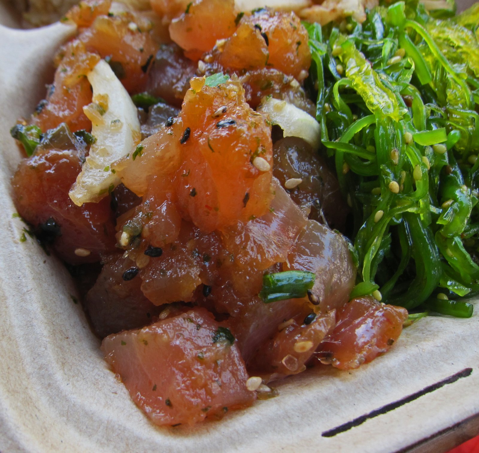 The portion sizes of the fish seemed to hover around 4-5 ounces. They told me, this was ahi……it seemed like tombo ahi – albacore, or even A'u as the fish seemed a bit mushy. Regardless, it was fresh, the flavors not too bad, maybe a bit on the salty side.