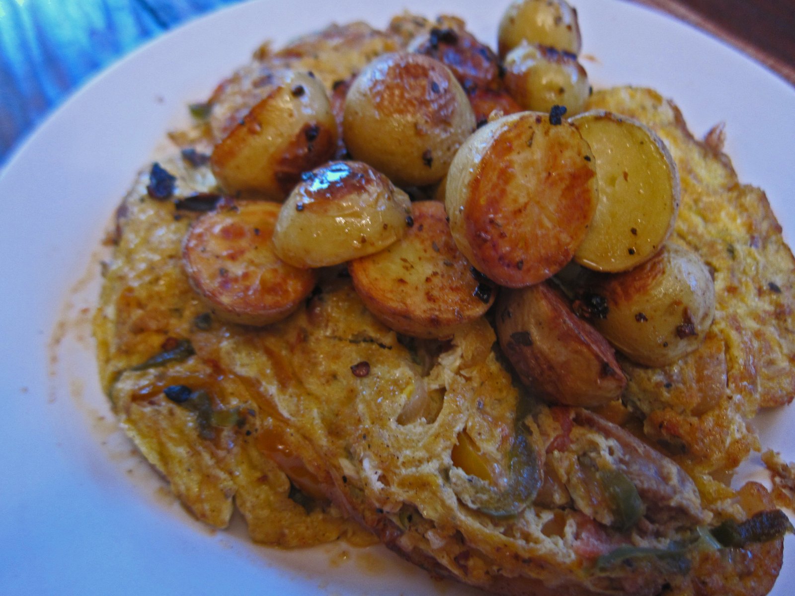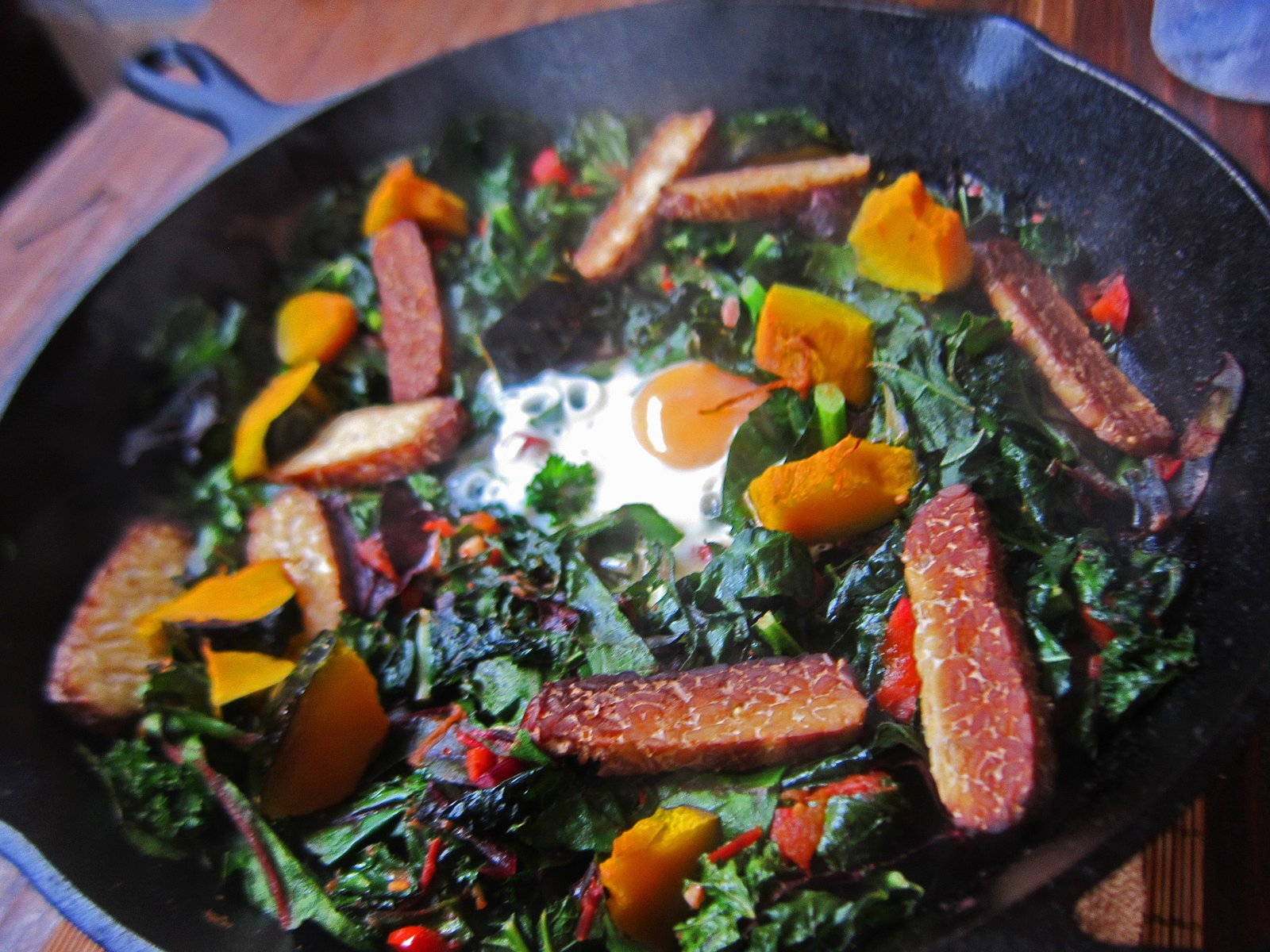 There had been a a couple of packages of tempeh in the fridge that the Missus bought….tempeh…..sigh…. I went ahead and smoked it for the Missus, which She told me tastes really good. I'll take Her word for it. She decided to take what was left of the "shakshuka thing" and mix that with shaved vegetable and roasted kabocha, sauteed, with an egg cracked in the middle finished in the oven.