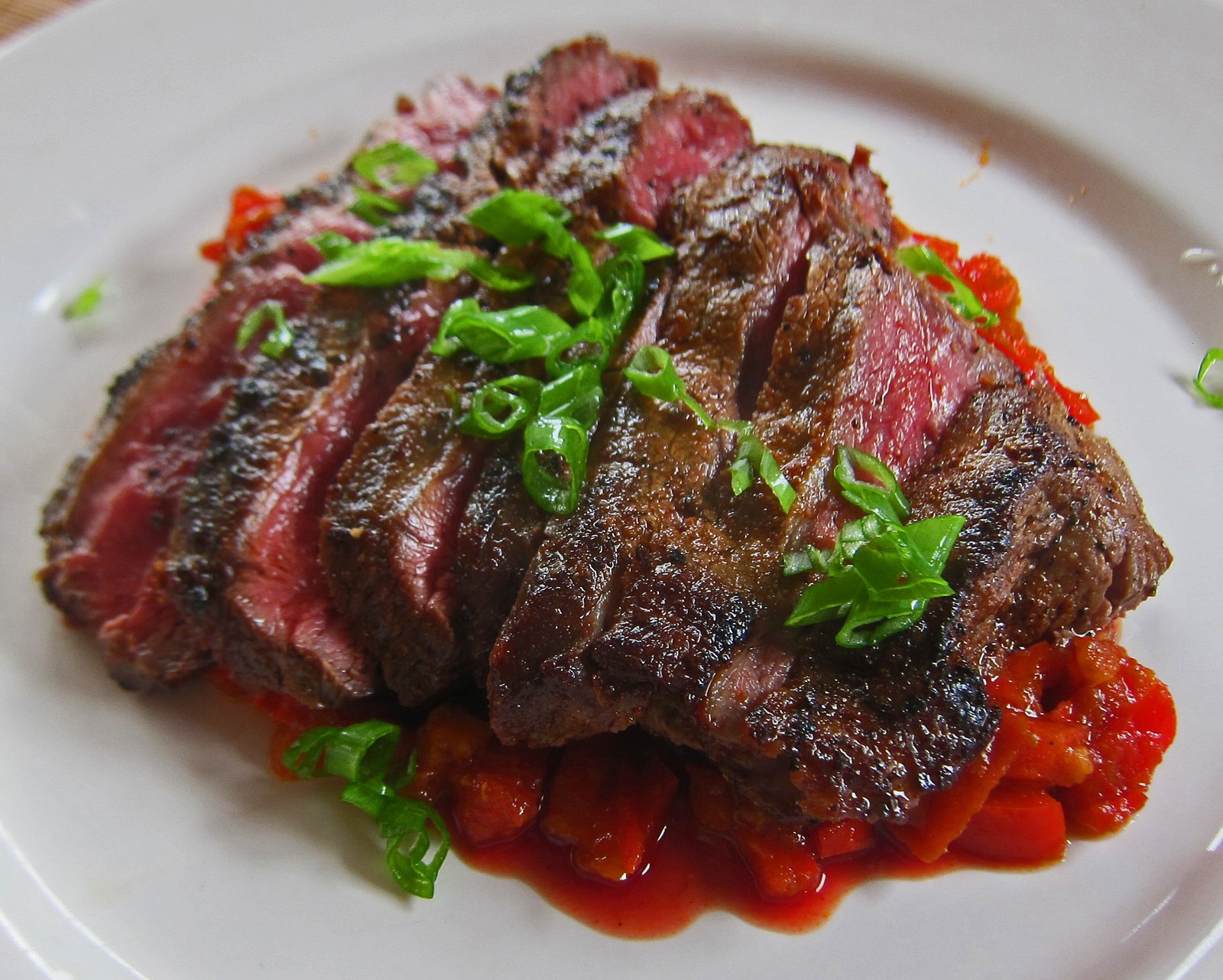 I've been making that pepper-tomato-harissa-cumin shakshuka thing. Here's a flat-iron steak seasoned with cumin-salt-pepper-paprika-granulated garlic-oregano, on top of the salsa/sauce.