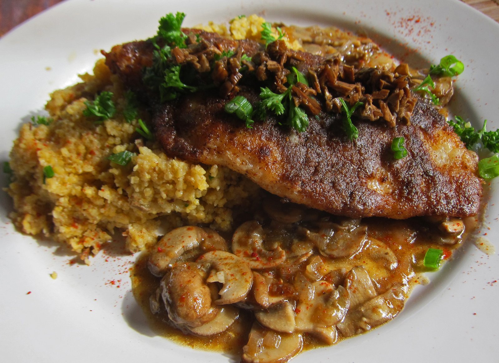 Step 9 – In a dry pan over medium high heat, place the sliced porcini mishrooms. When the mushrooms start to soften and give off their moisture add extra virgin olive oil, shallots, garlic, Turkish oregano, and reserved mushroom powder. When fragrant add reserved mushroom liquid and white wine and let bubble away. The fish should be ready by now. Set aside. Taste sauce and season (remember, there's salt and pepper in mushroom powder) with salt and pepper. Reduce……