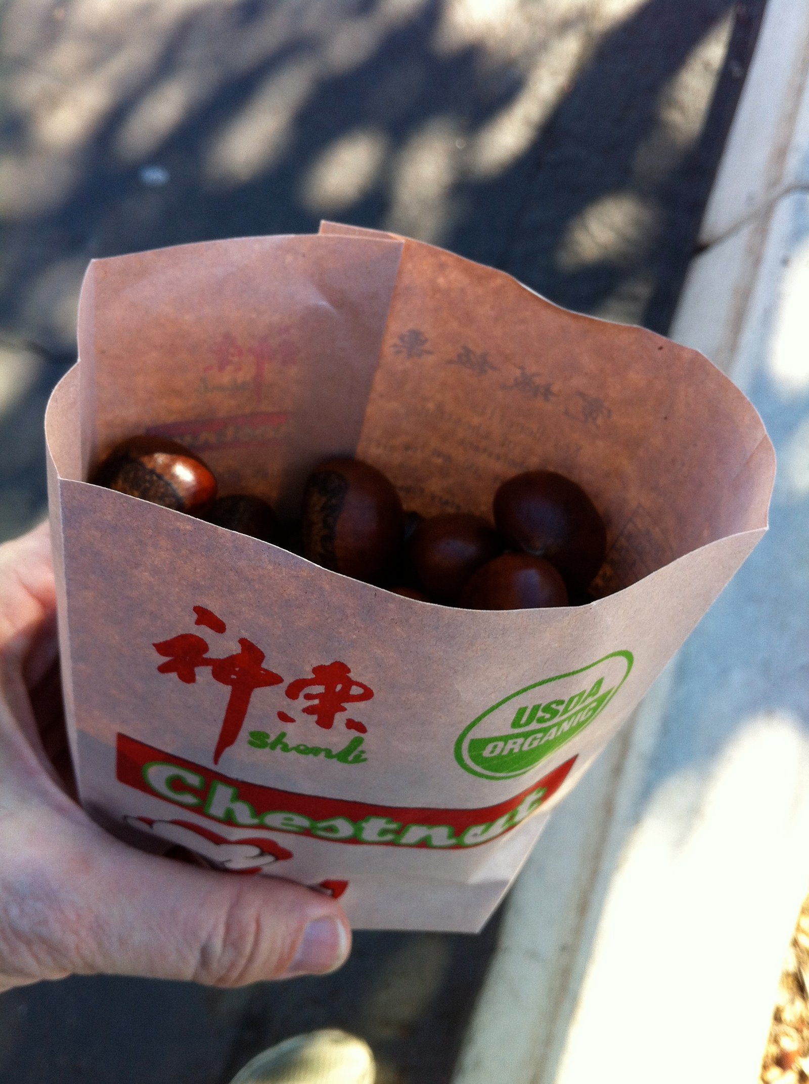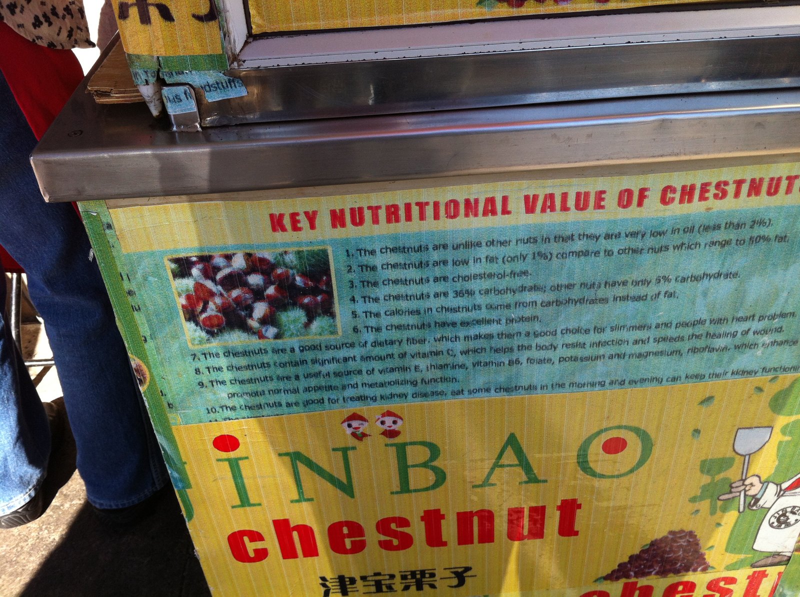 Stepping up closer to read the benefits of chestnuts (on another list, "Chestnuts are a lusty and masculine food for men, and able to make women well complexioned.") and getting a good whiff of the roast…