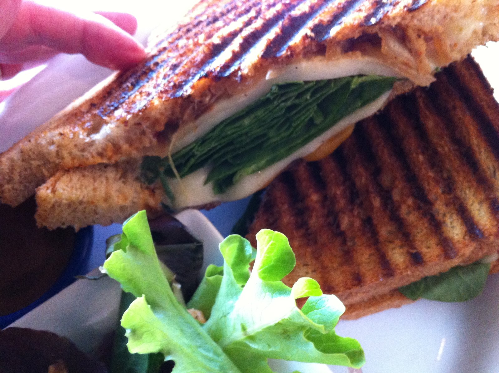 I don't remember the four cheeses, but the combination and meltiness was quite wonderful. Also in the sandwich were sauteed onions and mushrooms and tomato as well as fresh organic baby spinach.