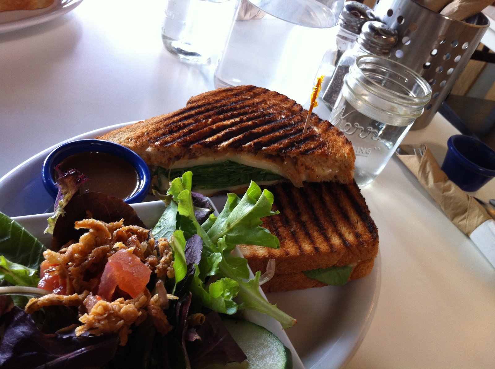 I ordered the Four Cheese Panini on multigrain bread. ($8.50) and chose the organic mixed green salad which was topped with crispy fried onions, included cucumber and tomatoes and had an oil and vinegar based dressing on the side. (See the water bottle and jelly jars?)