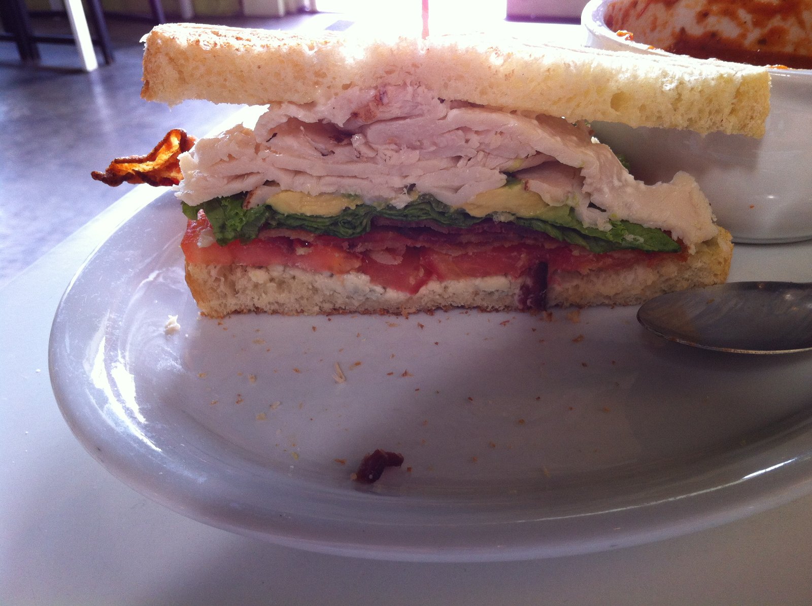 The Mister's Cobb Sandwich ($8.50) on artisan French bread. Pan roasted turkey, (thick, flavorful, crispy) bacon, avocado, tomato, leaf lettuce, Blue Cheese: a salad in a sandwich. It comes with a choice of a 'gourmet side', so he chose the tomato soup. This was *really* good.
