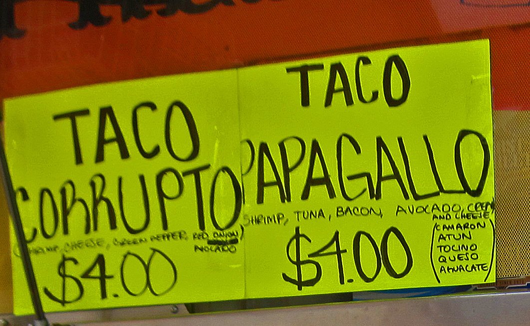 Love the sign for tacos curruptos. A meal for South Bay politician perhaps?