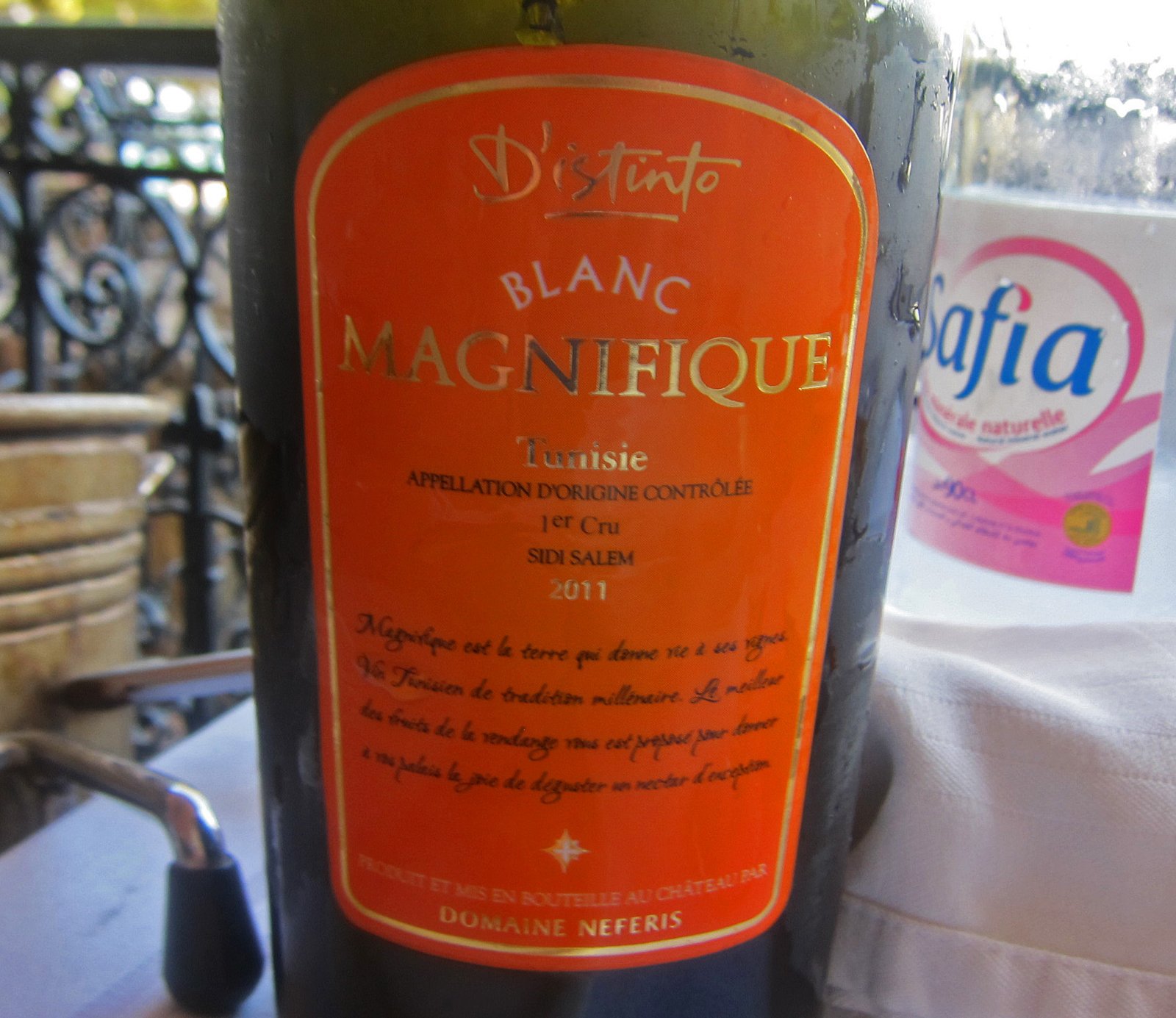 We were still in search of a Tunisian wine we really enjoyed. Not really knowing where to start and wanting a "blanc", we simply ordered the most expensive bottle on the menu at 42 Dinar, which was about $25 US at the time. It turned out to be a good choice as this bottle of Magnifique was light and refreshing, with a crispness to it. We ended up getting this whenever we saw it on the menu.