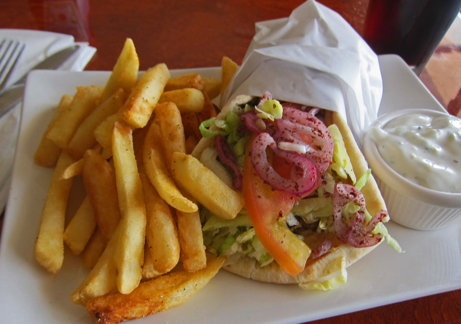 Basically mass produced pita, with some mildly seasoned kofta meat, a bit on the dry side. Iceberg lettuce, tomato (which was actually pretty good), red onion, and sumac. Throw in some rather limp fries and a mild yogurt sauce. Nothing really special. It was nice to have this option in the neighborhood, but this didn't seem like a good value.