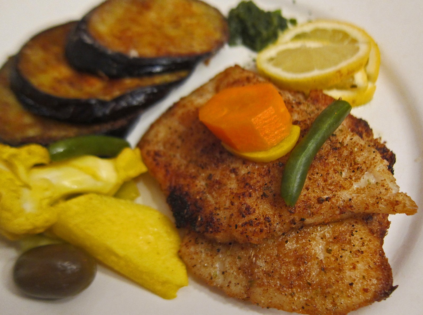 Here's a Turkish Spiced Halibut, Crisp Roasted Eggplant, Pickled Vegetables and Afghan Chatni.