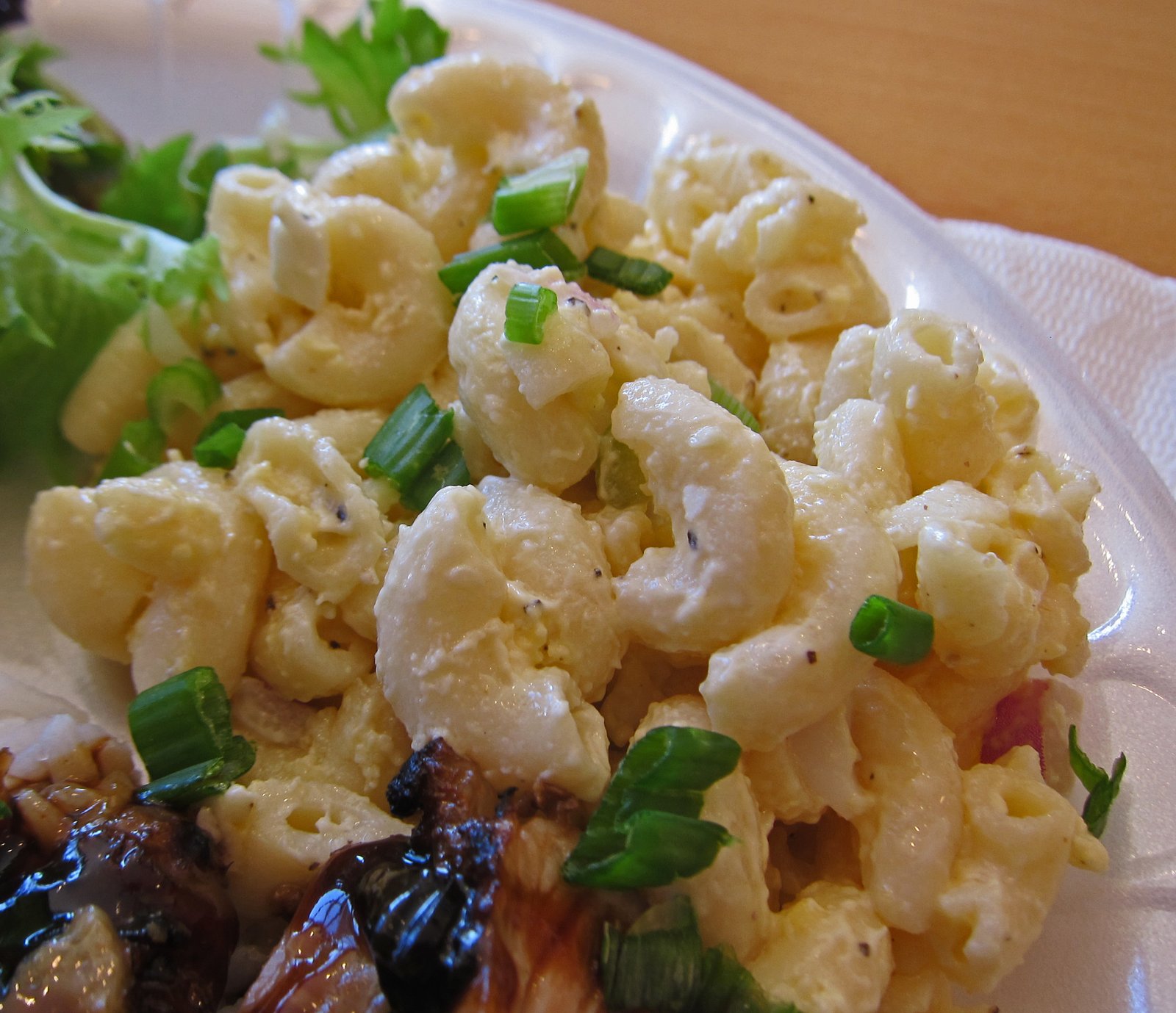 The mac salad was plain, but nice made, he macaroni was done perfectly, and the seasoning and he amount of mayo was good as well.