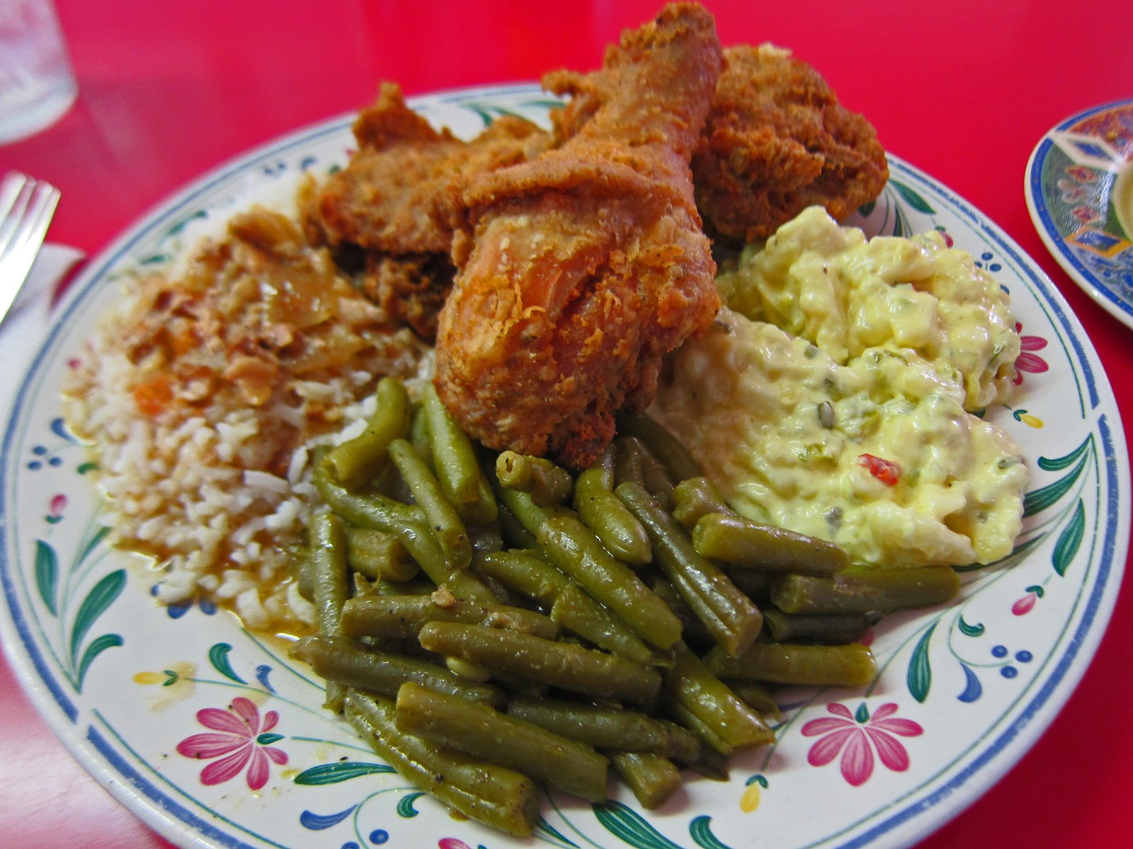 In terms of the sides. The green beans were typical canned and cooked, the gravy was nice, but the rice a bit hard. I really enjoyed that potato salad, tangy and creamy, it really did well by me.