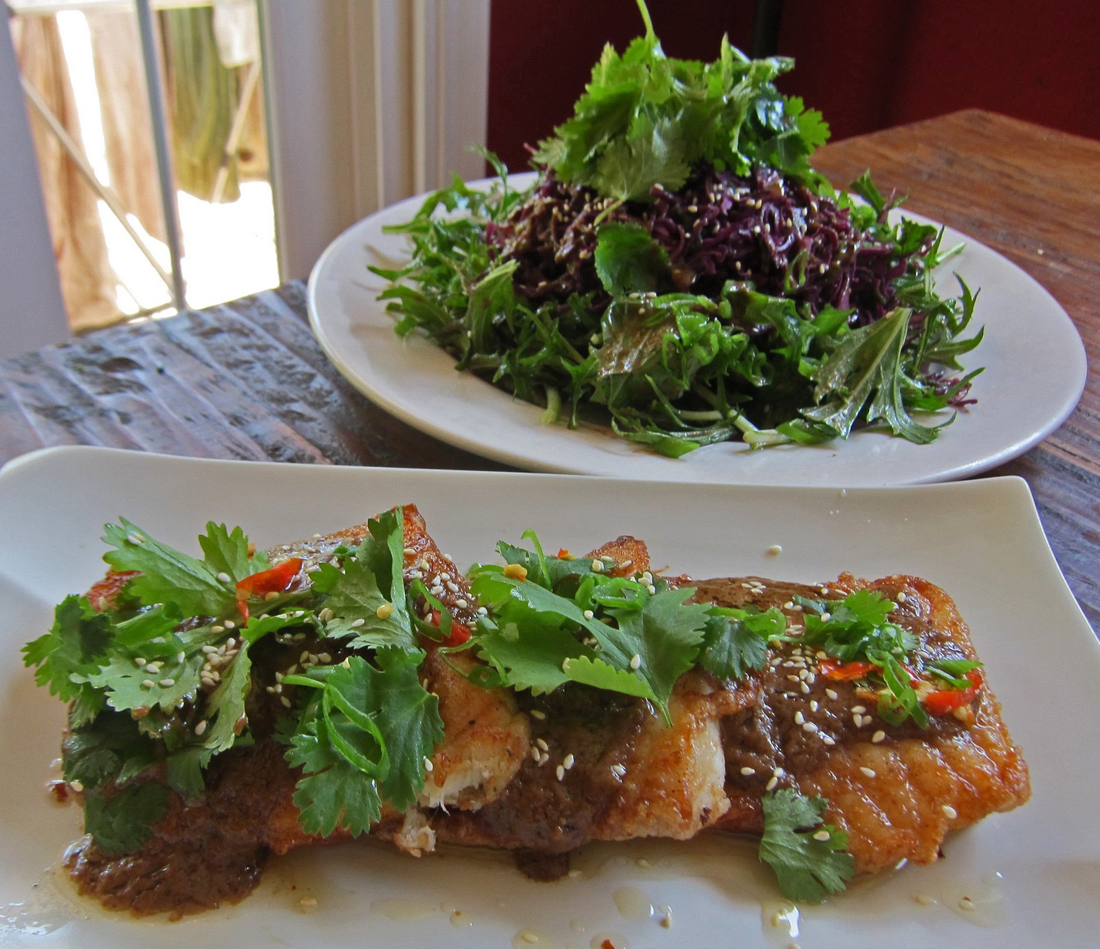 I then dust the fish with potato starch and pan fry. Spoon on the sauce, garnish with scallions, cilantro, sesame seeds and some really spicy red chilies.