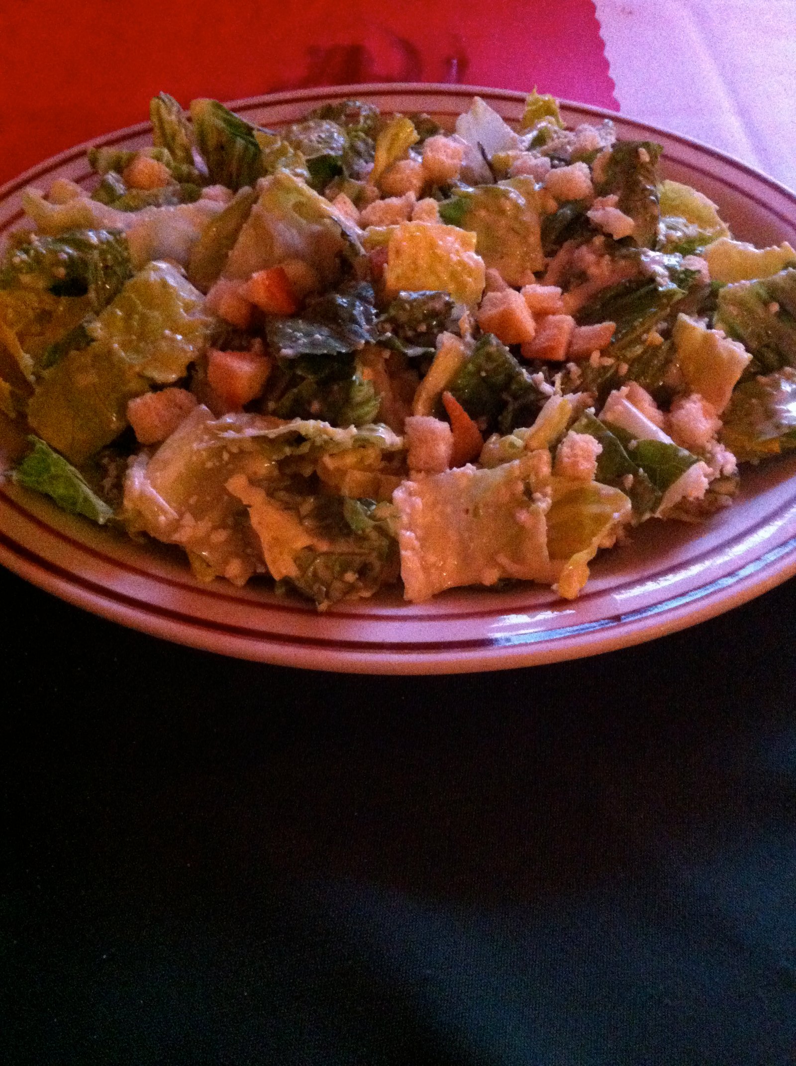 A simple Caesar salad ($7.95). Sometimes this large serving of crisp lettuce topped with garlicy goodness is shared along with some other item.