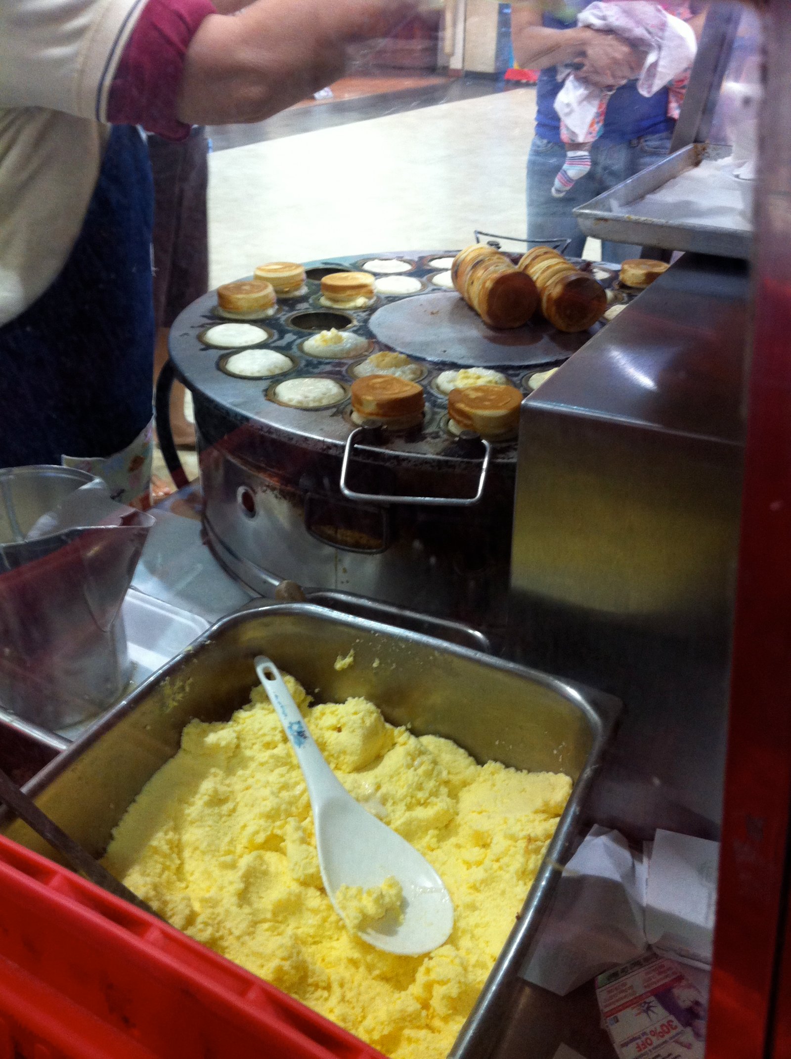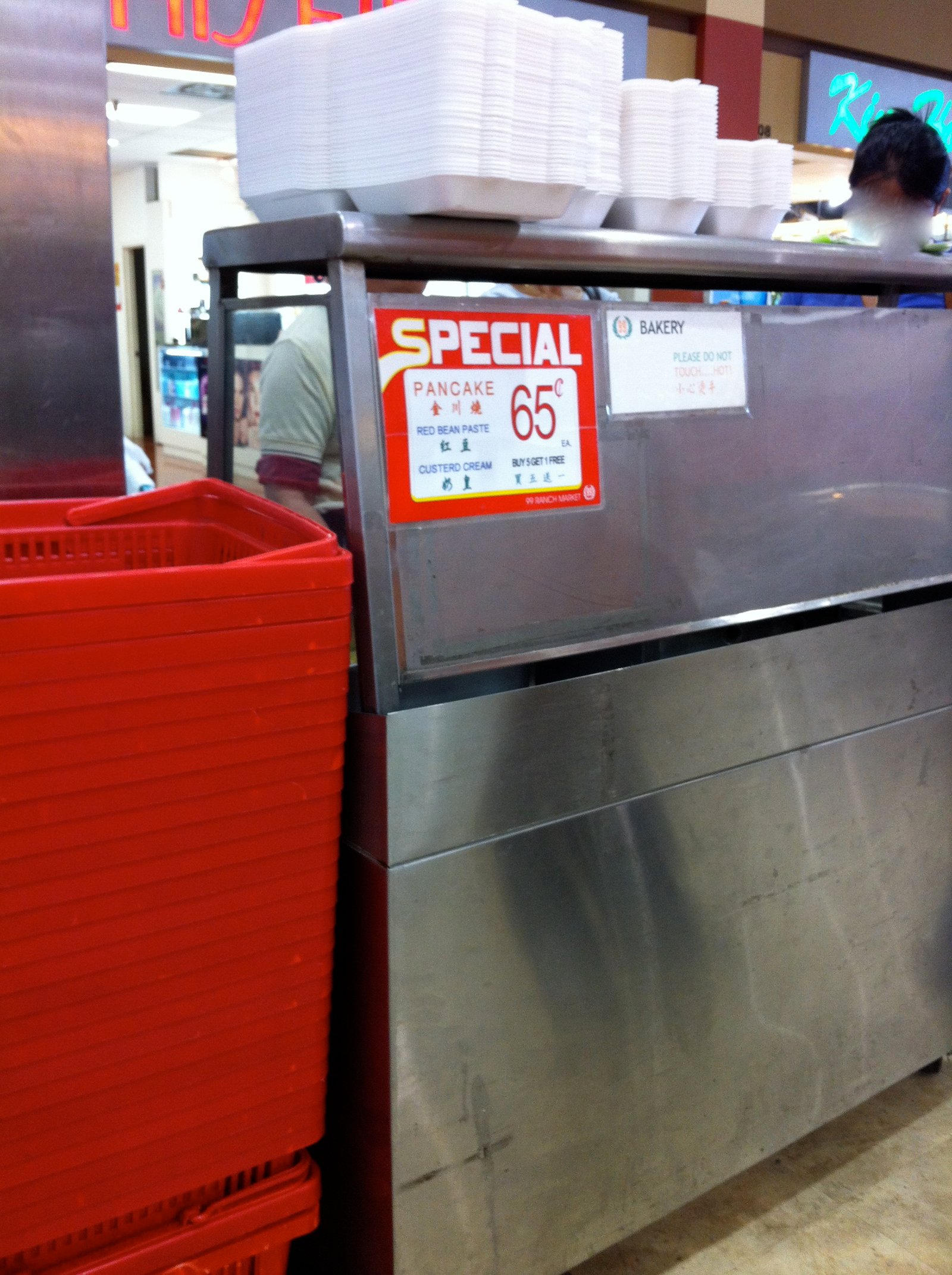 1. I hate it that you have to (first) pay for it with the cashier b/c the lines to check out on weekends are SO long. But these lil’ pancakes – I call them Asian ebelskivers 🙂 – are so awesome when they’re hot and fresh. I usually just eat the outside though (and secretly want to ask the girl making them to stuff them w/ nutella)..