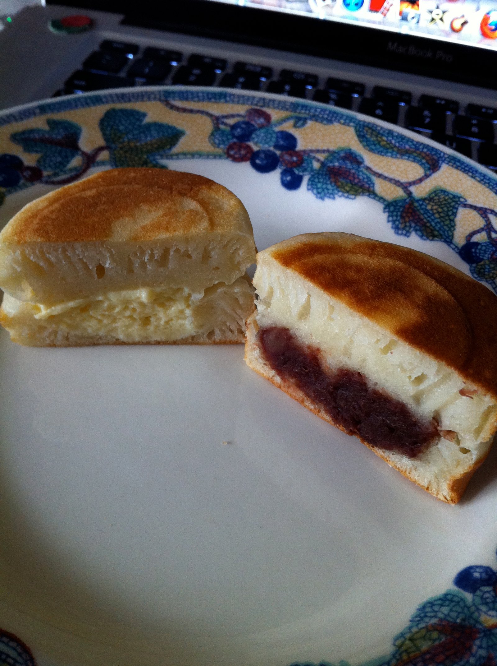 On the center section are already baked red bean paste pancakes.  The fresh batter is being baked in the unique pan and when finished baking (the top is baked/not sticky but not browned…with the rounded top-like what happens when you make cupcakes) and then is placed on top of another baked half, which has filling in it (in this case, the custard cream) the two halves manage to stay together, because they are both hot and ready when placed on top of each other. IMG_3671