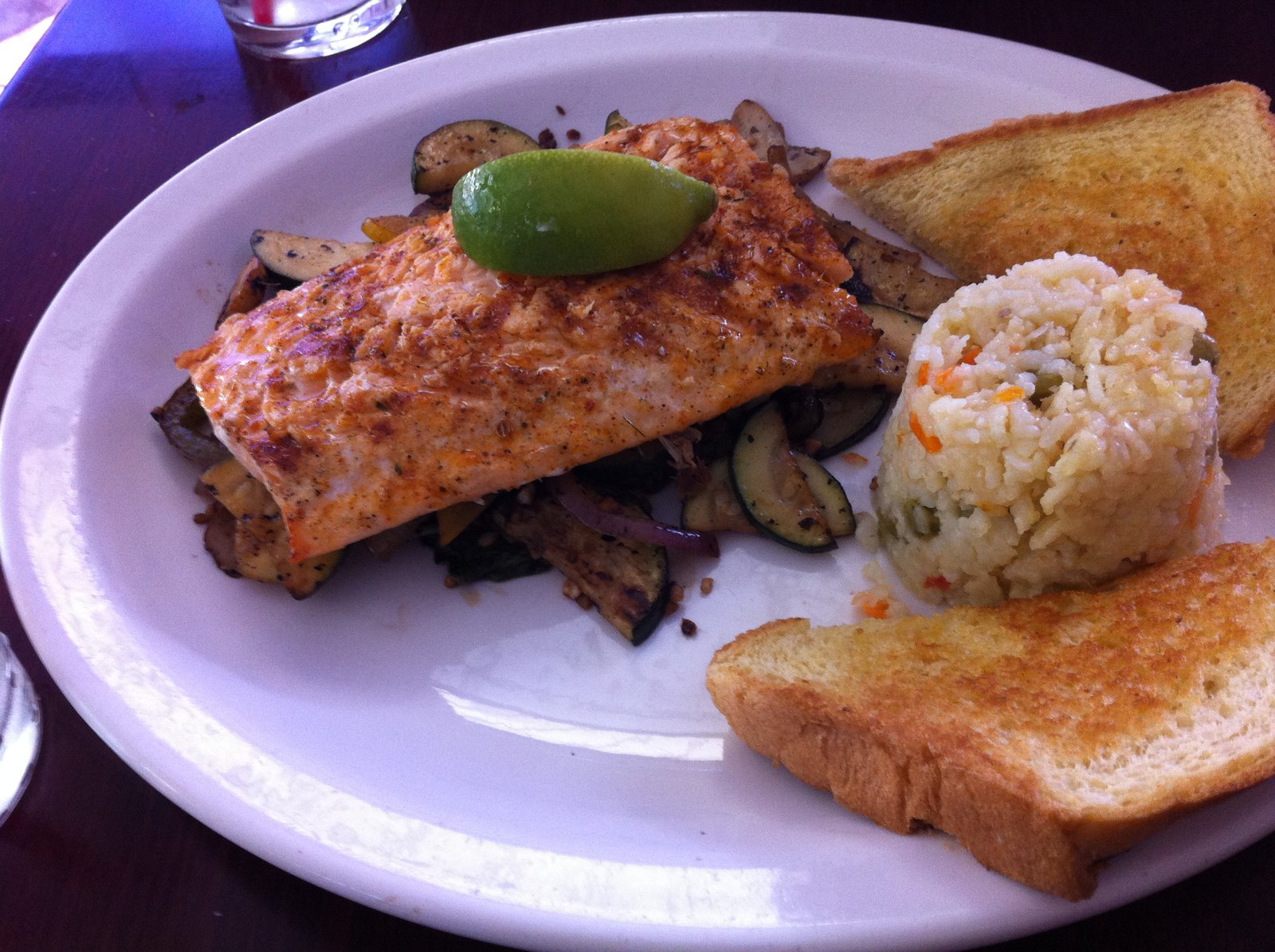 You may have noticed a lot of writing on the front window. In addition to a 'take out' discount of 15% on everything, there are also Early Bird specials from 3-6 daily. Above is a photo of the Early Bird grilled salmon plate ($8.95) which is served on a bed of grilled vegetables with grilled garlic bread and Spanish rice. This is a large portion and very filling. Always fresh fish grilled perfectly.