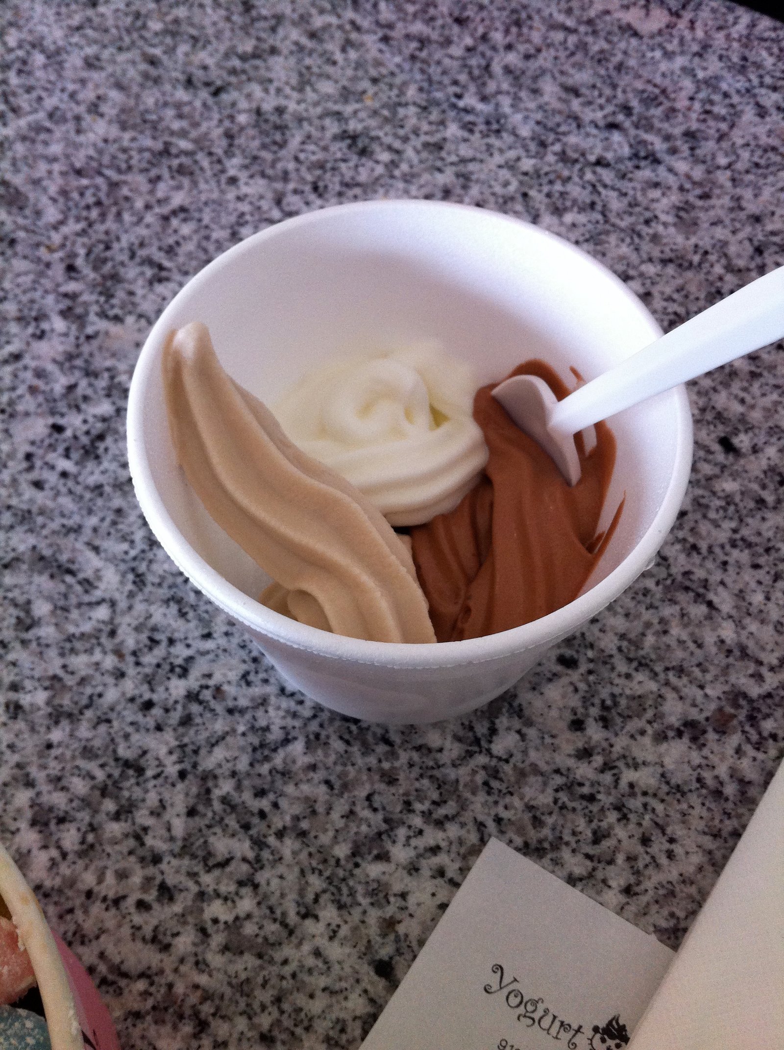 The Mister took a small amount of yogurt flavors to try. The plain yougurt is wonderfully tart, the way I like it. The chocolate had a very pronounced cocoa flavor. His third choice, strawberry, had no artificial color (as you can see) and it tasted very much like fresh (not artificial) strawberry.