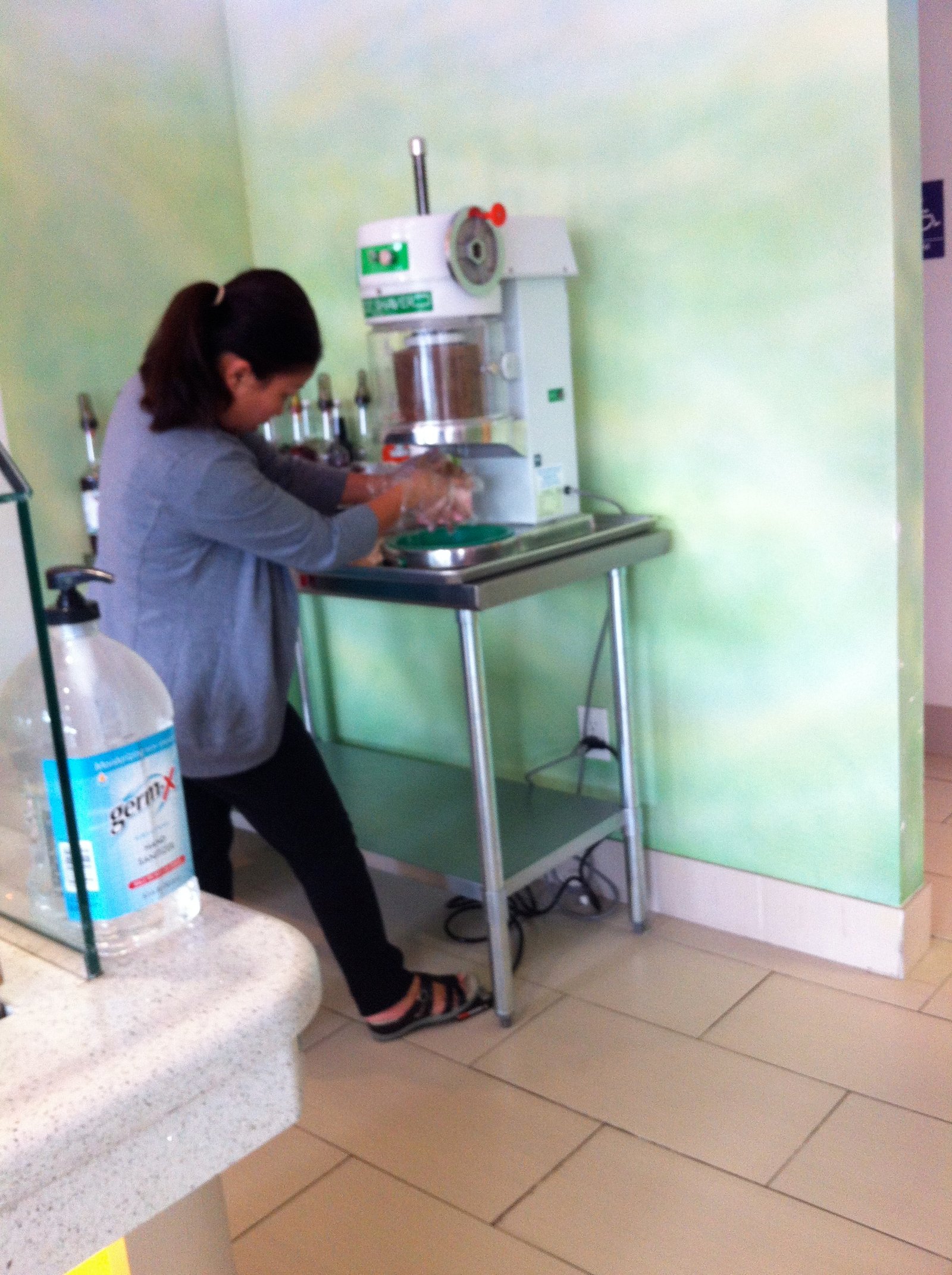 The snow ice shaver. We ordered a small mocha flavored snow and the nice lady went to the back and brought out that rounded block of ice creamy goodness, placed it in under the clear dome and started the machine going with the foot pedal.