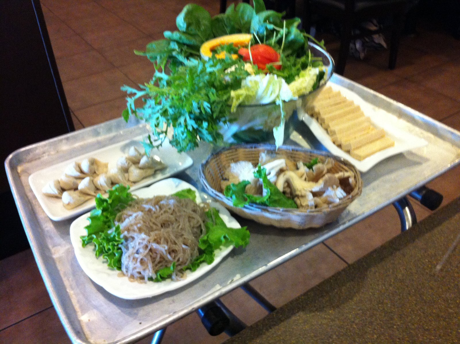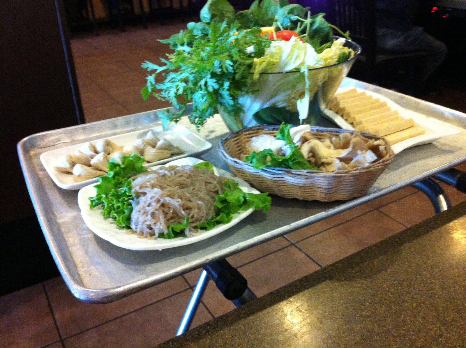 We decided not to order the $9.99 Lunch Specials, since that would mean the same group of vegetables with the only variable being the type of meat. Instead, we chose our own items. These, which were brought out first, would cook in the broths first (a faux pas, I know: the meat should be brought out first to flavor the broth), before the simmer happened. From the far right, going clockwise: frozen tofu ($2.95), oyster mushrooms ($4.95), yam noodle ($4.95), lamb wonton($6.5o) and the beautiful bowl of veggie combo platter ($9.95). I must say, we made excellent choices. Everything was outstanding, working a bit differently with the varied broths. We all agreed the most interesting and flavorful vegetable from the 'veggie combo platter' was tangho. It was slightly bitter and kept a good texture in the hot pot. We also agreed the oyster mushrooms were really tasty and meaty.