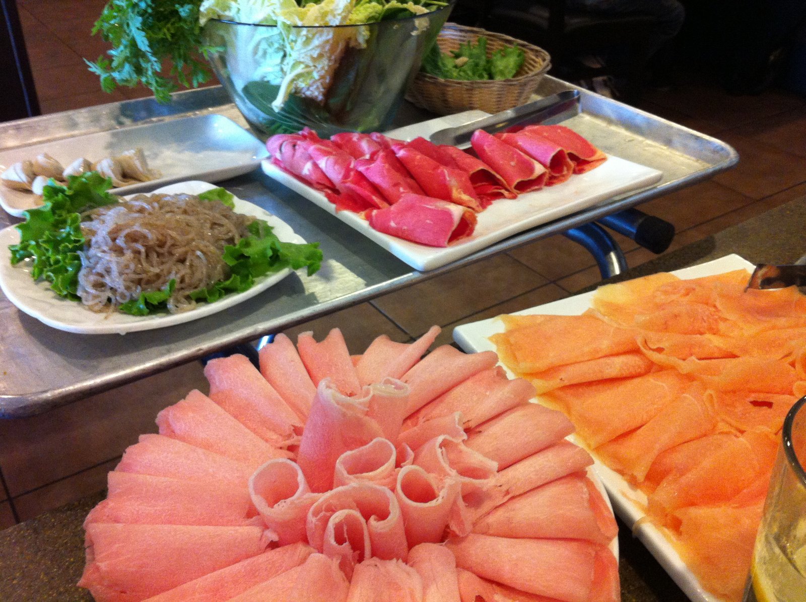 Our thinly sliced meats were brought out soon enough. We ordered the pork ($5.95), chicken ($5.95) and beef and lamb plate ($10.95)…each meat cooked quickly in the bubbling cauldron (which was refilled with broth) and again took on a different taste depending on the spices in each section. Again, we made excellent choices.