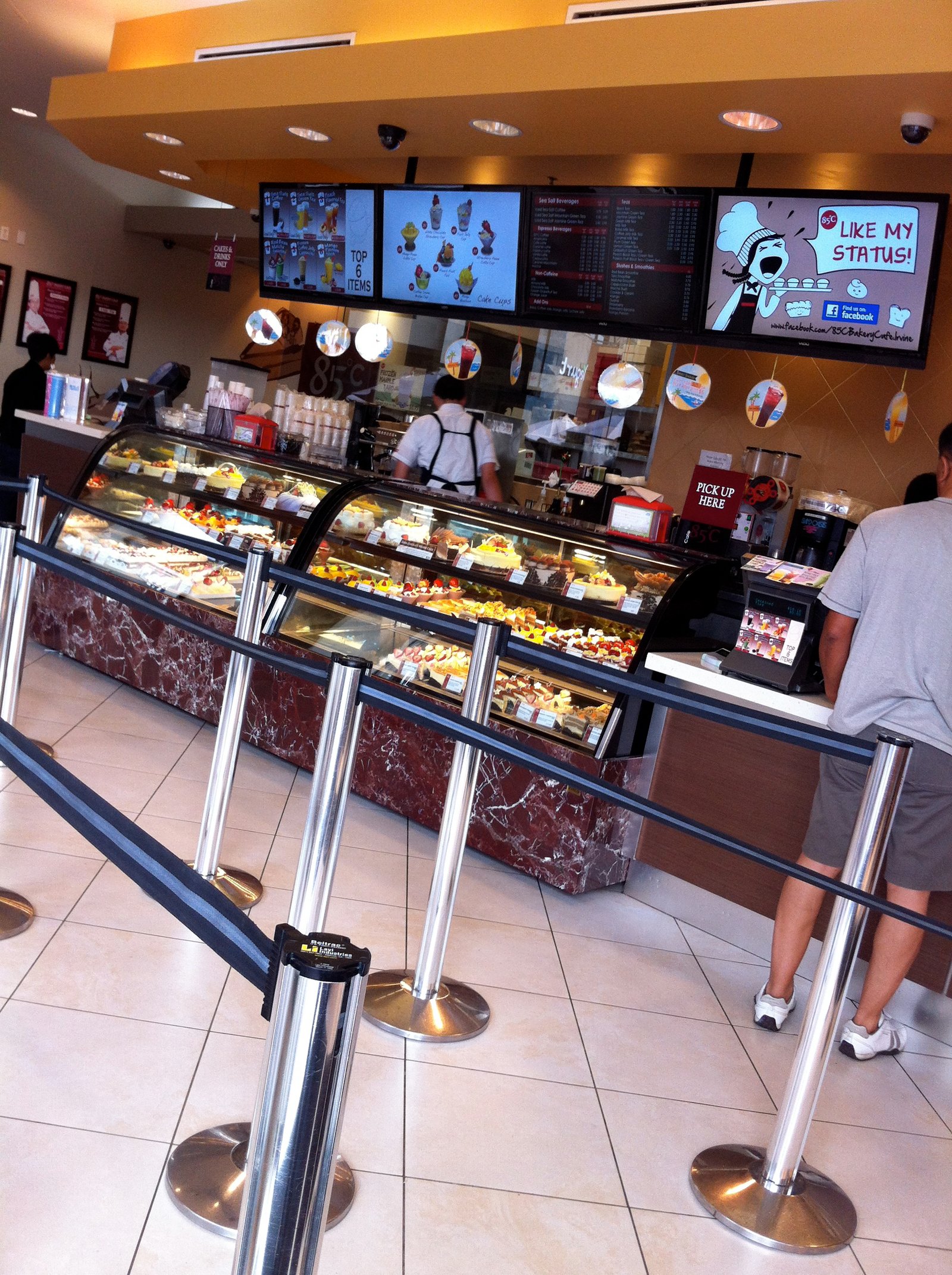 When cc and I arrived here just before 9 a.m., we missed an onslaught of customers by less than five minutes. When I brought The Mister here, we were in the parking lot five minutes before the doors opened. I really try to avoid crowds. The above refrierated glass case holds cakes and cake slices…