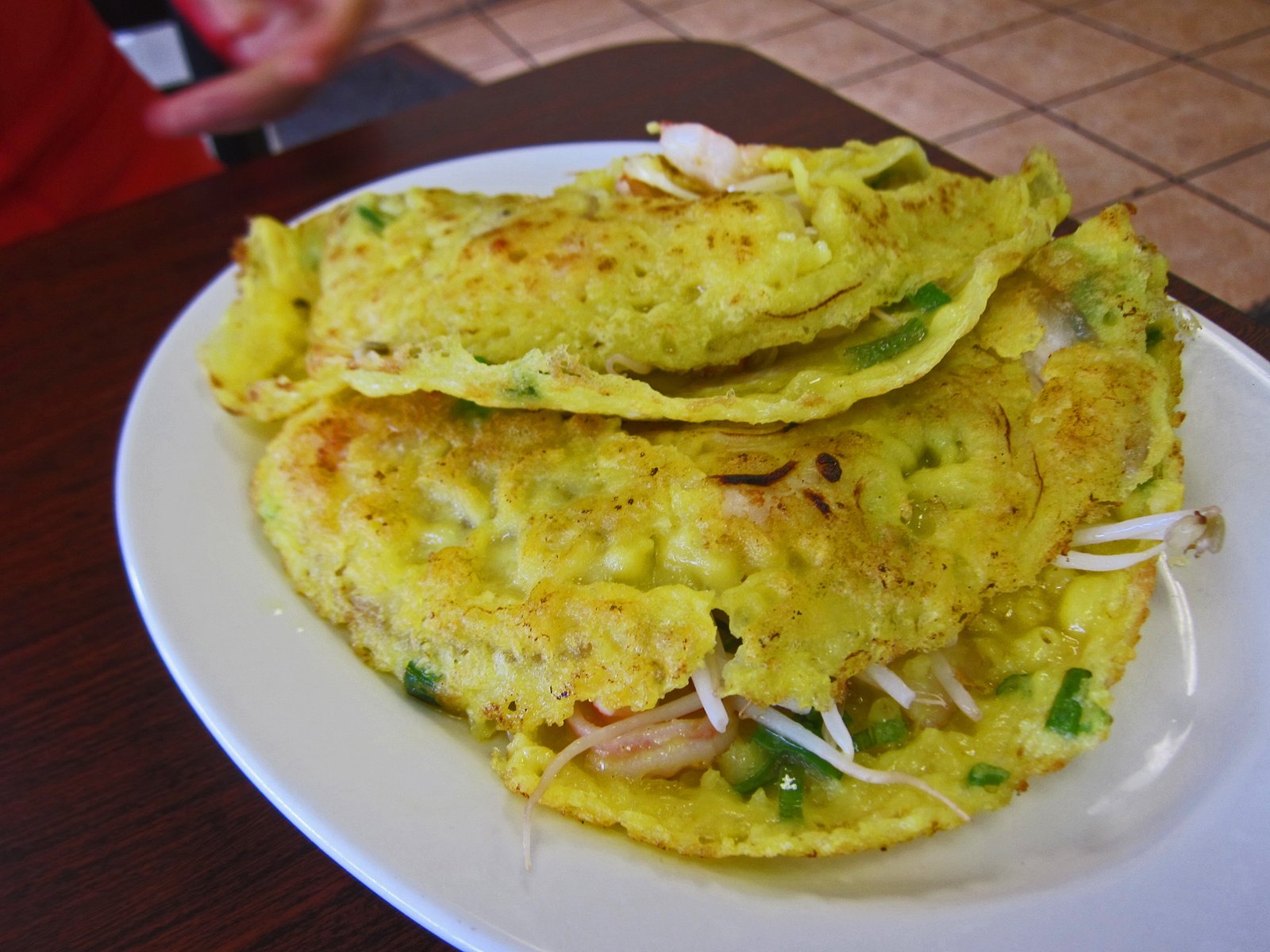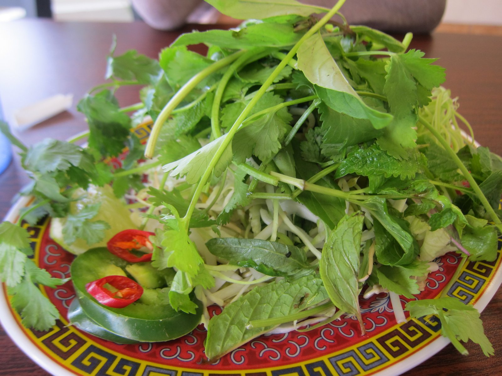 We were both surprised when not one, but two crepes were brought out. Along with the veggies and herbs, this was quite a bit of food. These were ok, the scant pork really tough and the meager shrimp overcooked and rubbery. If I recall, this was like about five bucks….really cheap. But we'd have preferred a smaller portion with a better product.