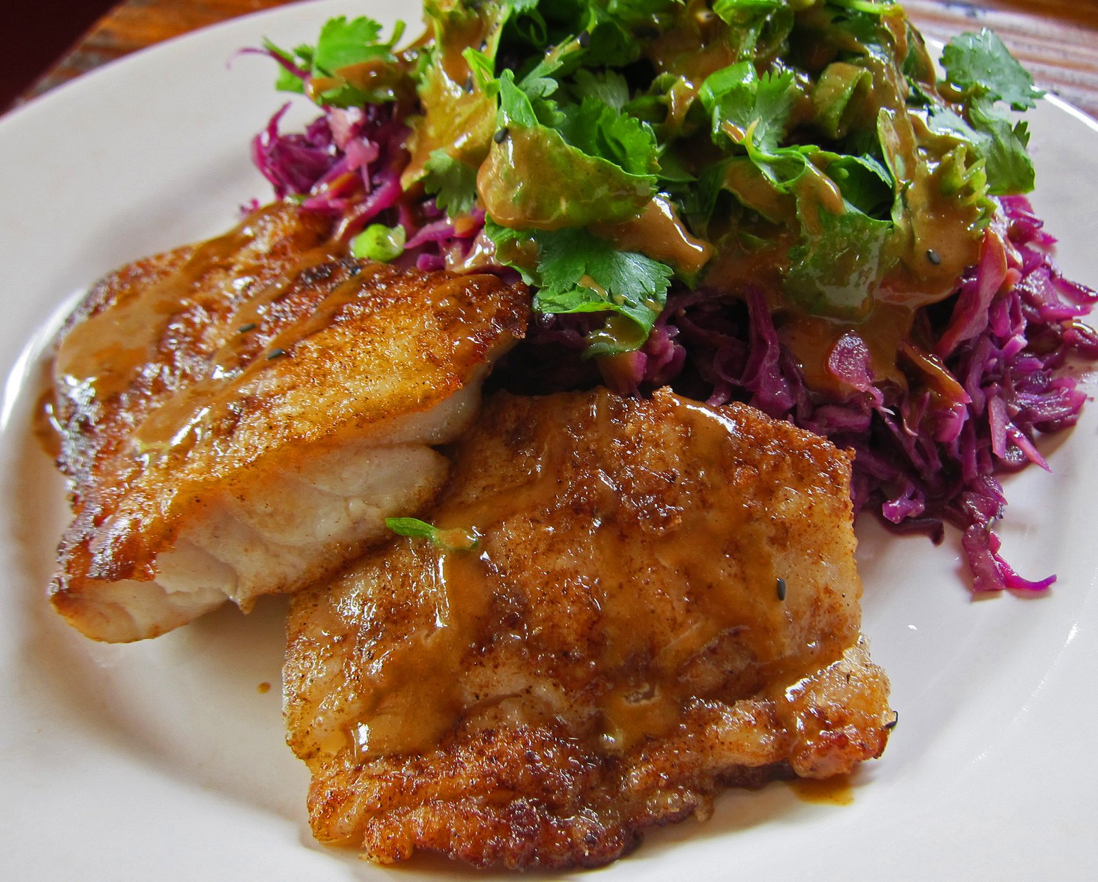 I had a bit left and decided to try something more "Asian" for dinner. I did the typical Shaoxing – ginger juice – white pepper Chinese style marinade. Seasoned with sea salt and five spice from QingDao and dusted one side with potato starch. Served up with my basic dressing for Purple Cabbage Slaw, this was very nice.