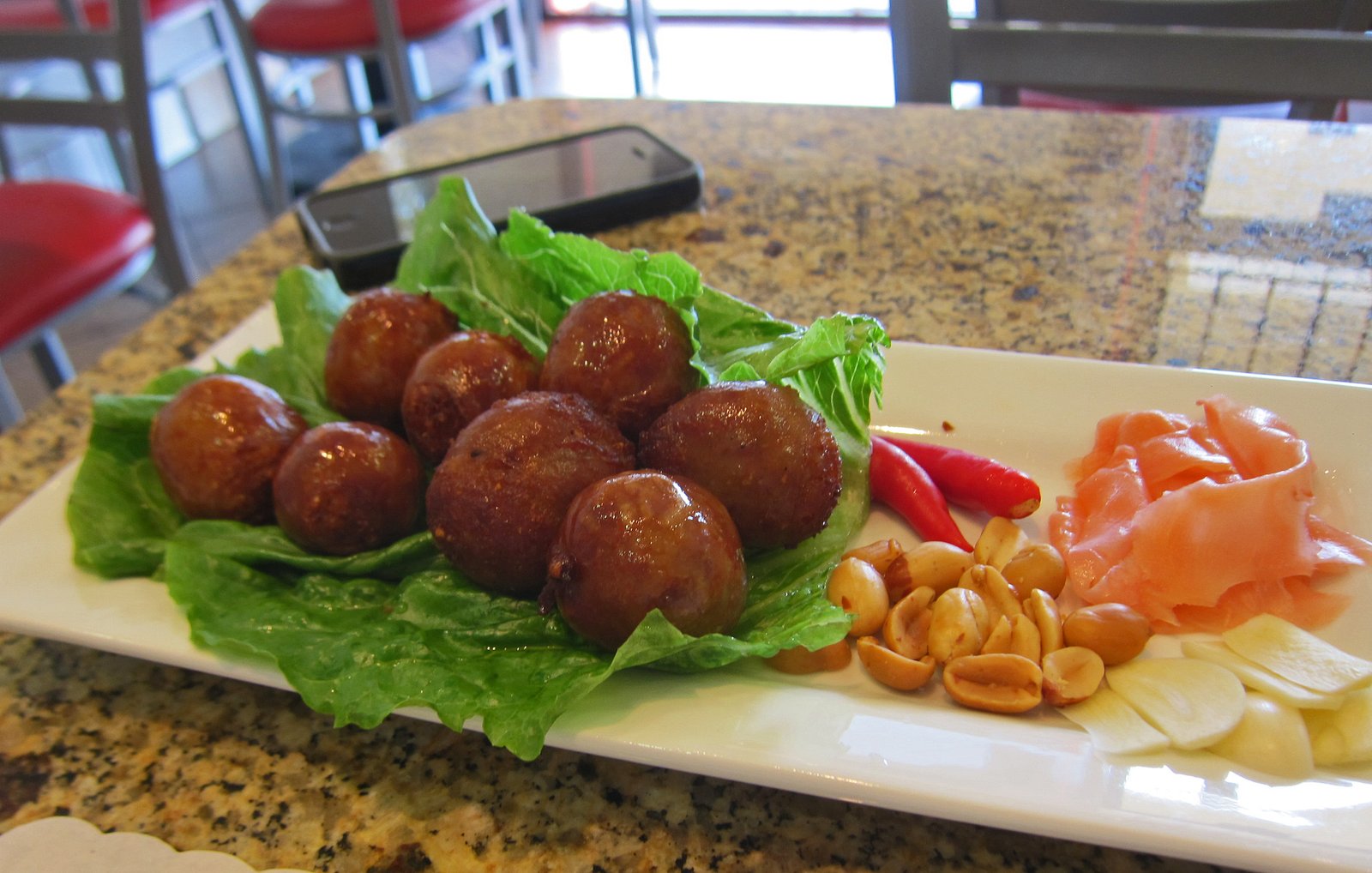 So this was the roundish "Sai Krok" I've encountered before. What really threw me off was the Japanese Benishoga – pickled ginger that was served with the dish. C'mon…really? I also prefer some cabbage rather than a single leaf of lettuce, but I've had it this way before. The sausage was too mushy for my taste, without enough sour-fermented flavor. It also seemed to be mostly rice. Sadly, this was the best item I've had here……
