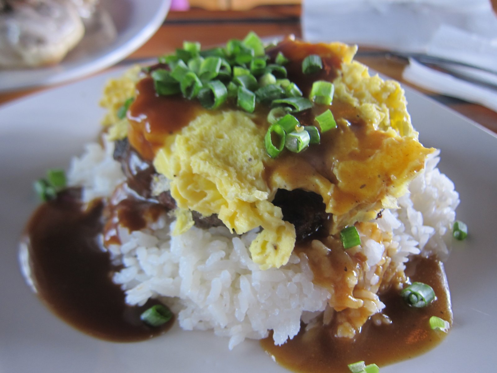 Which brings us to the loco moco. I originally ordered it with straight up and traditional beef brown gravy, but Dennis talked us into getting it "half-and-half" with half beef gravy, the other half Japanese Curry. At first I was kind of doubtful, but hey after having the Kaloko Moco who am I to criticize?