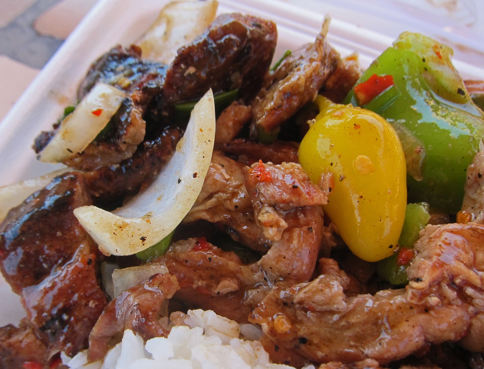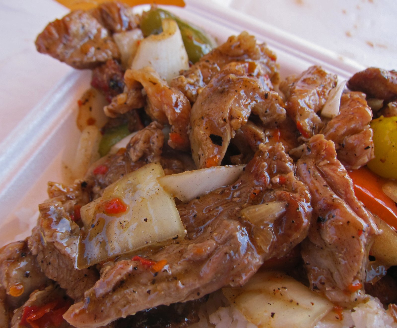 Man, talk about enough carbs to keep you runnin' for a while….it's like three scoops of rice. The chicken is grilled, but not dry, and is dark meat which has more flavor. I enjoy the different riffs on Filipino BBQ, salty, sweetness from sugar or even 7-up, perhaps a fruitiness from Jufran, sour of Kalamansi, a hint of garlic, a touch sweet-pungent onions…..the list can get fairly long. The version here is very mild, coated with sauce, and for me, occupies a level barely above the food court "same chicken with a different sauce".
