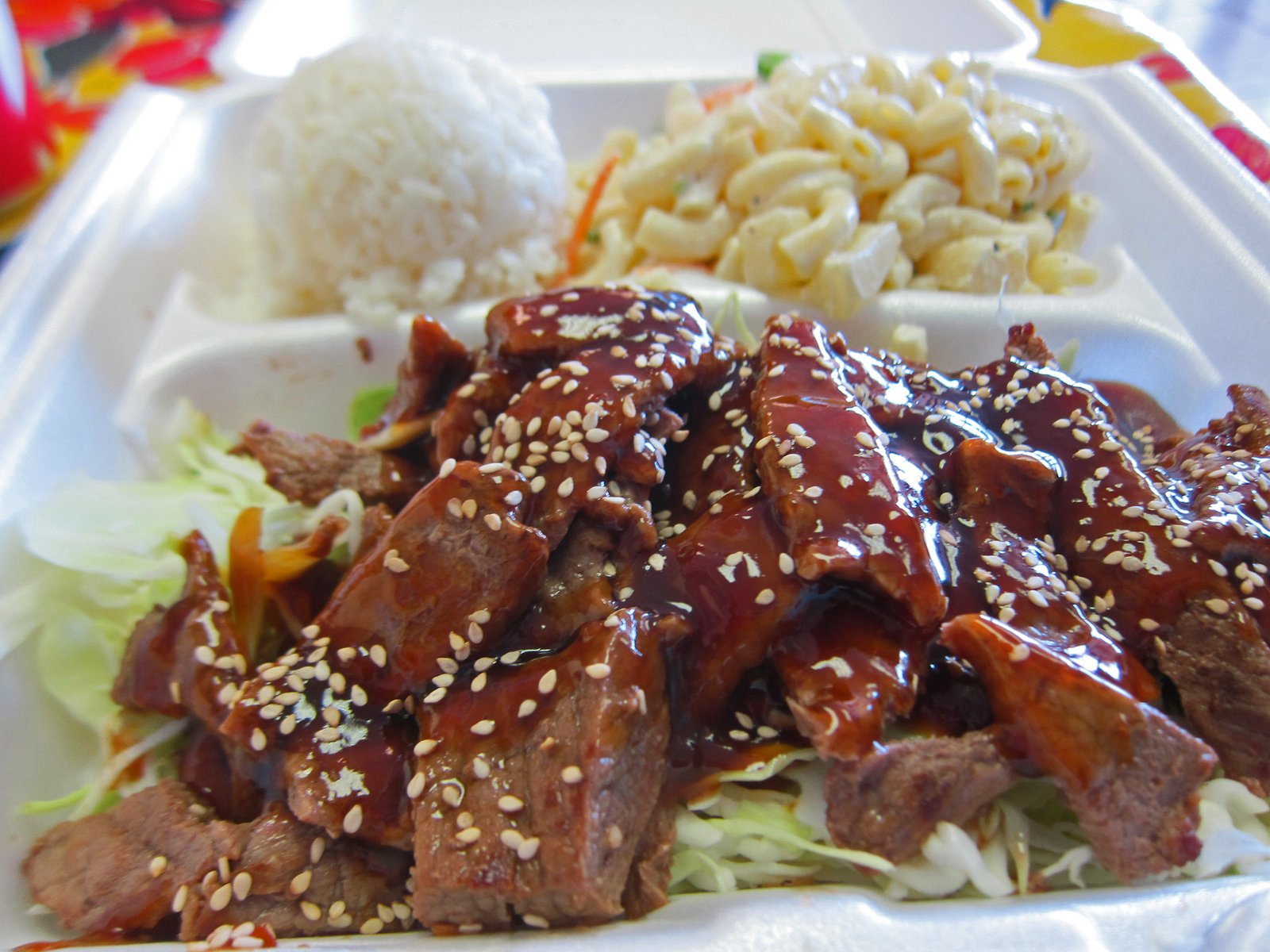 First the basics. The rice was perfect, though I'm not a big fan of the mac salad here….too loose and too sweet. The beef was quite tough; literally the two dollar steak. It really lacked flavor and was also cold, like it had been sitting in a pan somewhere and maybe put in the microwave for a (too) short time. It lacked color, which made it look less appetizing. The sauce totally reminded me of the teriyaki we used to make; when we couldn't get mirin….which was a good part of my childhood. It was too salty. Frankly, I don't care if you microwave your meat, but marinate it well, some color would be good, too. I've moved on from using thick cut low quality beef, you can still get decent thin cut beef which you can marinate appropriately and still have osmething tender. It wasn't horrible; just mediocre.