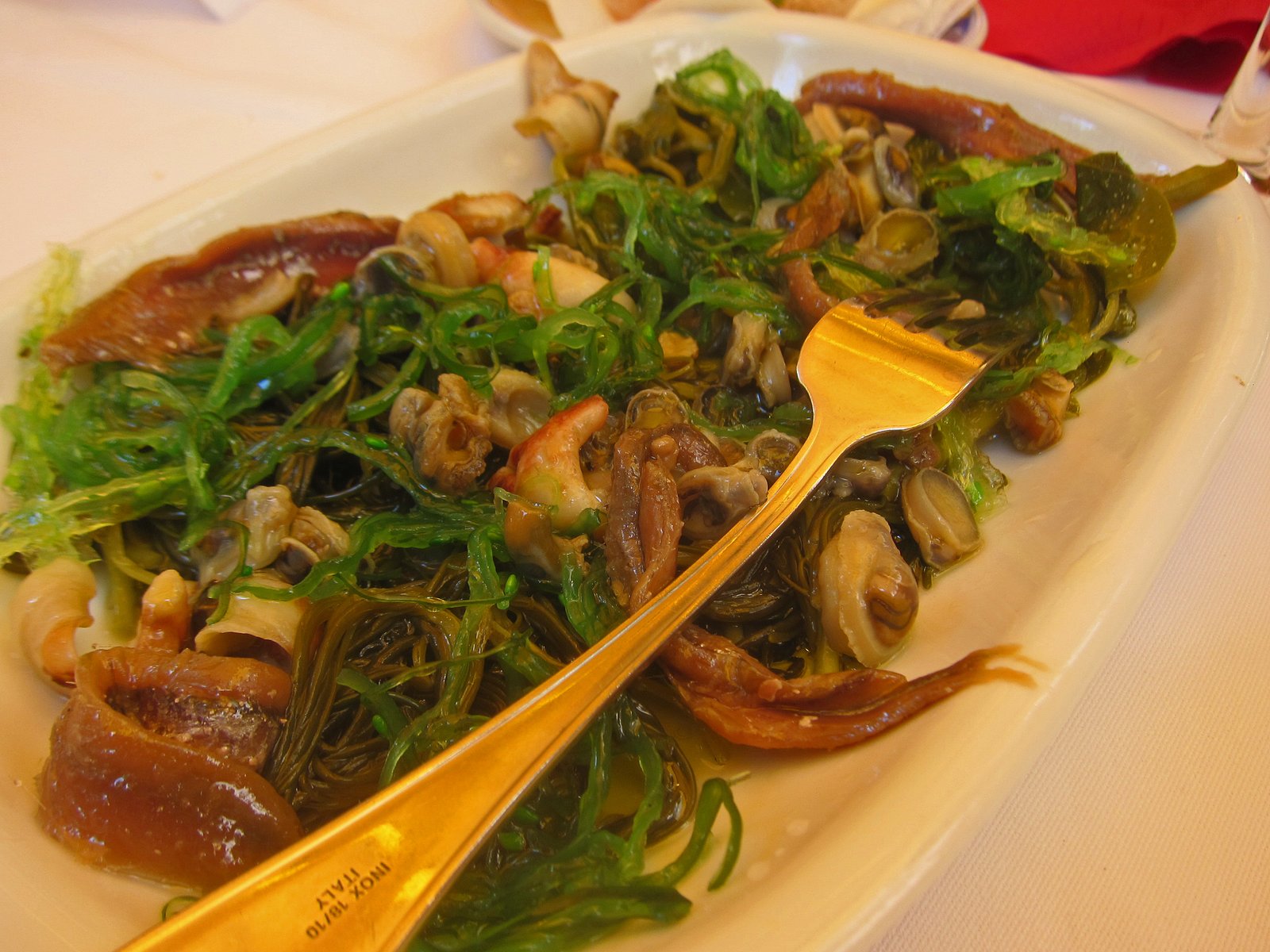 I'm so glad I ordered this. There was seaweed, of course, nice but nothing really special. Then there's the collection of various limpets, sea snails and such, some of which were really tasty; the flavor of the Mediterranean condensed into a single bite. Loved the various textures, some soft and buttery, other chewy like abalone. I looked at a piece…..and it looked like opihi and even tasted like a milder version of it. There were some very briney barnacles as well. By now the tour groups had indeed left, to the relief of the three tables of customers in the place. I realize that having tour groups keeps these places in business, but man, that was painful.