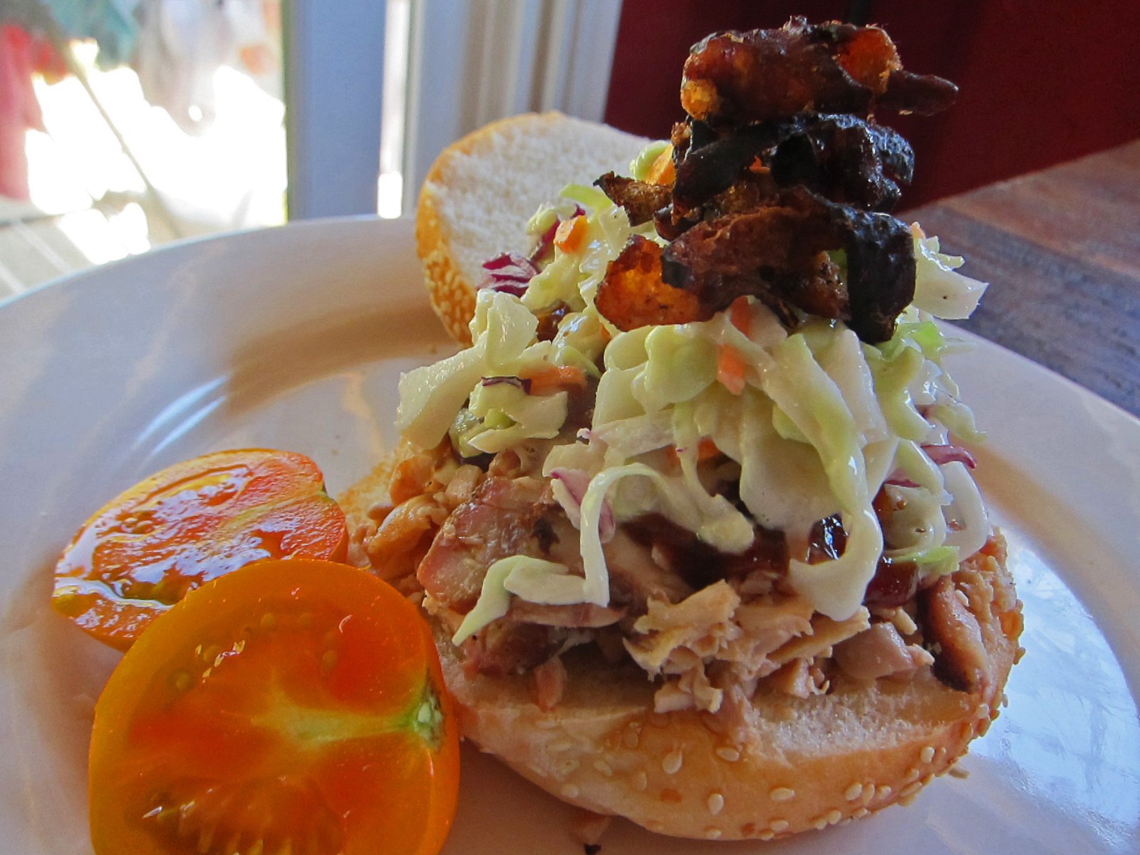 See those "black bits" on top of the chicken? Well, the skin really doesn't get super crisp. So what I do is remove them; pat dry, chop, then deep dry….deep fried smoked chicken skin. Man, that was good! Made for a nice topping on my BBQ Chicken Sandwich along with some coleslaw.