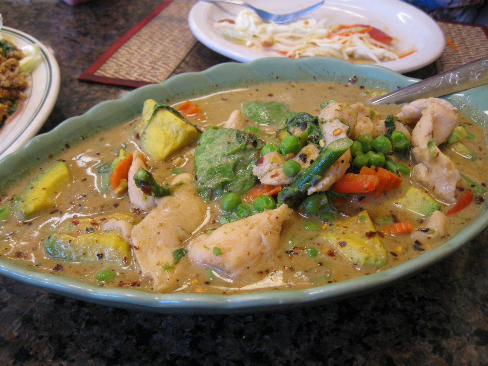 On the other hand, a daily special, the green curry with avocado (with chicken as the protein choice) ($14) was a hit with all of us. The green curry sauce was nicely balanced with sweet, tangy, and hot spicy notes. We also liked the mix of vegetables – the asparagus was a good addition to the peas, carrots, and sweet peppers, – and the abundant avocado chunks were smooth and buttery: