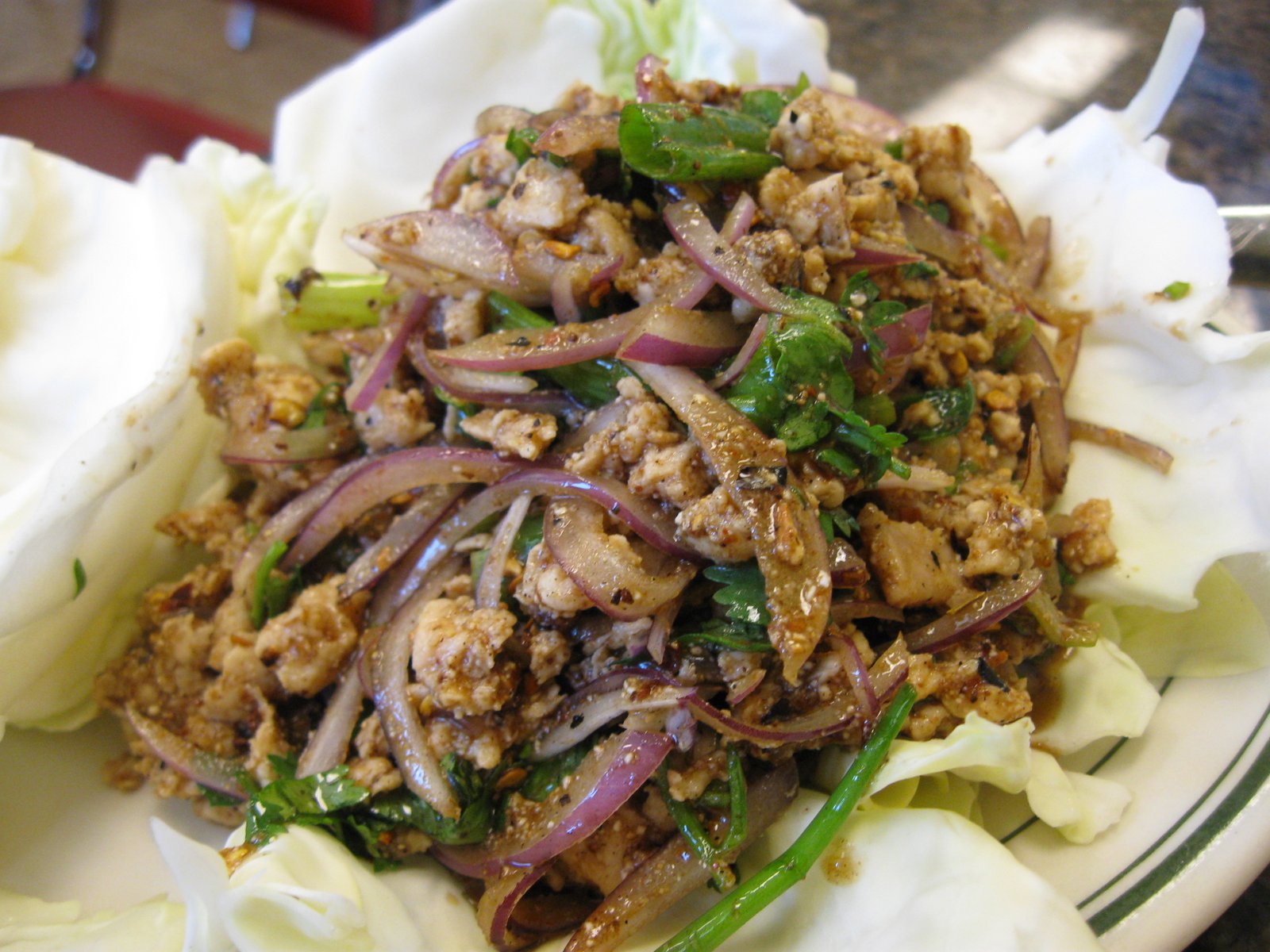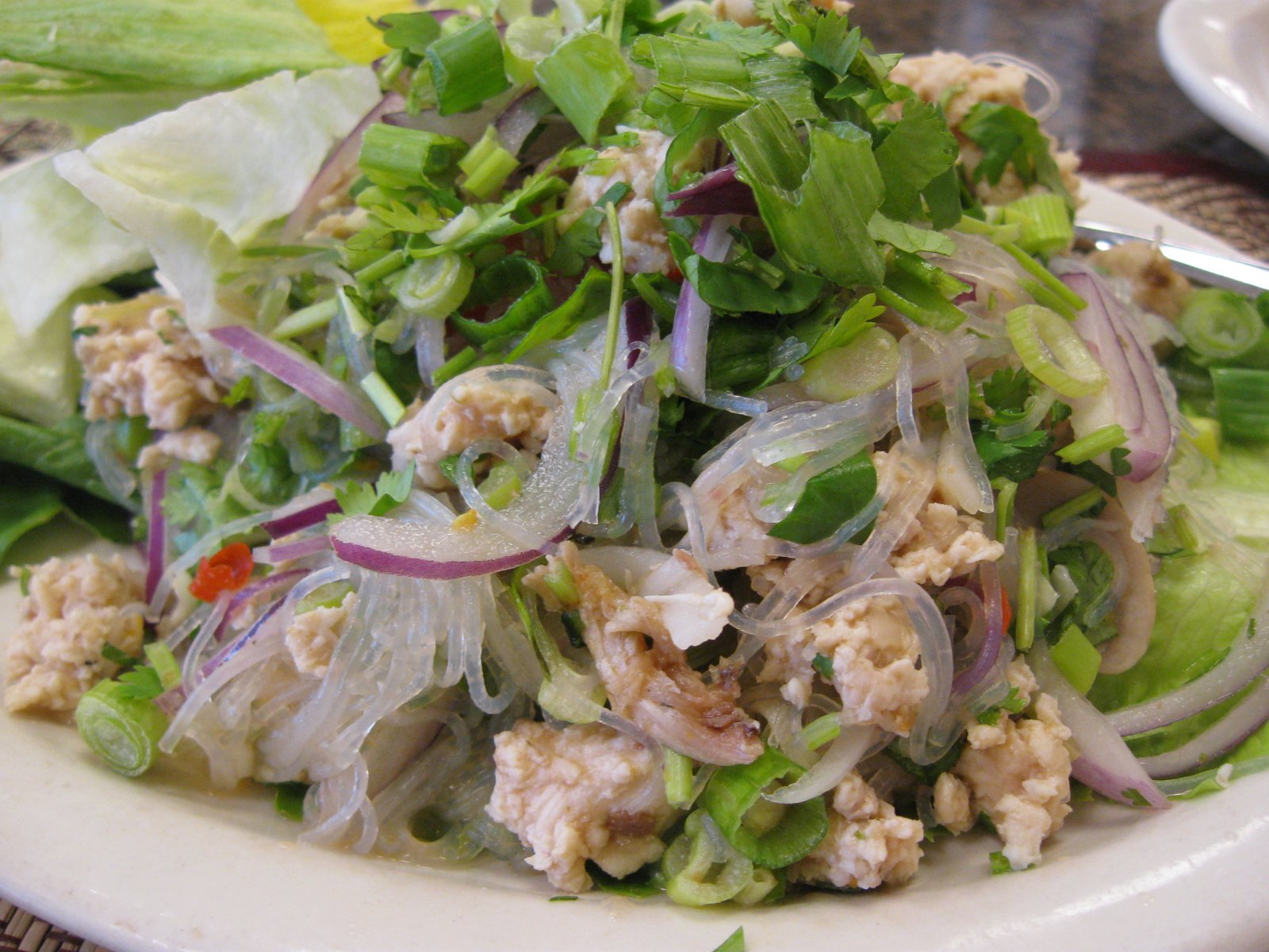 Available with either ground chicken or ground pork, we liked the cool clear noodles highlighted with citrus flavors and spice. The sliced red onion and diced green onion provided contrast.