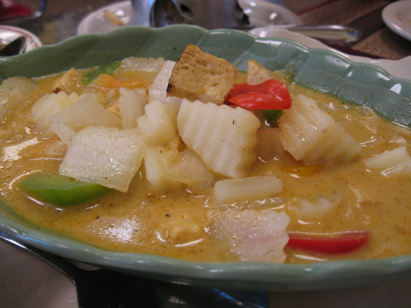 I've also had the chance to try two different curries. The yellow curry (ordered with tofu as the protein choice) ($9) was the less impressive. The mild sweet curry sauce didn't seem quite flavorful enough to make up for the numerous bland potato chunks and the cubes of fried tofu. Perhaps if we had ordered it very spicy or chosen a different protein, the results would have been better: