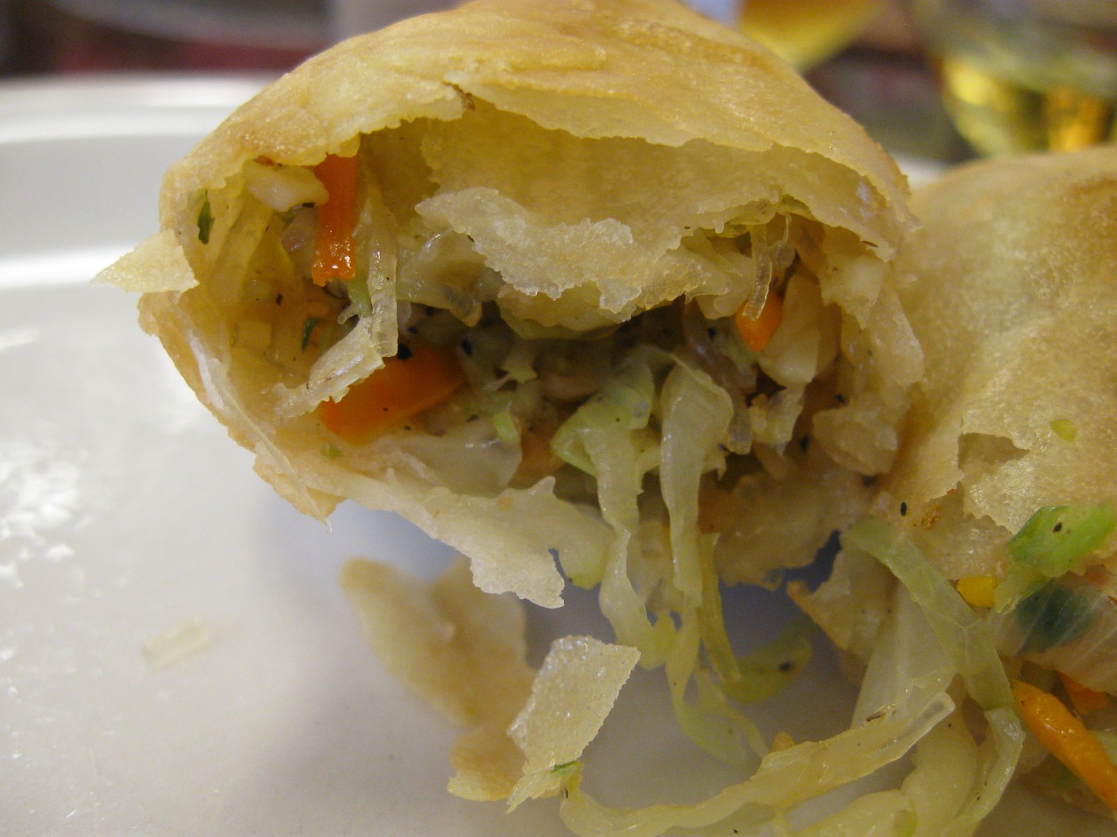 These were served fresh from the fryer too hot to handle. Although no lettuce leaves were provided to help one pick them up, the accompanying ketchup based sauce was a nice balance between sweet and savory. While just a little greasy to the touch, each crunchy wrapper contained a nice selection of thinly sliced vegetables and clear noodles: