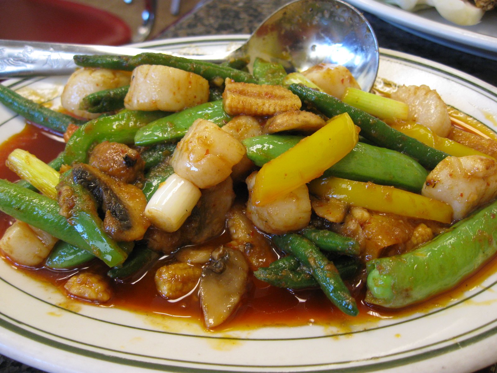 Similarly, the spicy scallop stirfry ($14) was quite good. The scallops were very fresh and not overcooked. The whole dish contained deep savory flavors. In addition, we liked the green beans and the fresh garden peas still in the pod. In fact, the presence of actual fresh peas in this dish and in the green avocado curry was a nice touch at a time when so many restaurants fall back on the convenience of frozen peas: