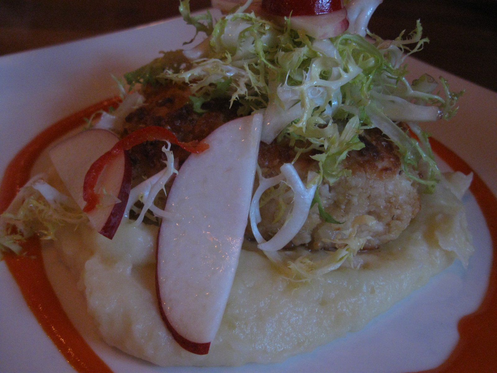 The perfectly cooked piece of halibut rested on a soft fluffy bed of buttery mashed Yukon potatoes. The fish was topped with fresh frisee and slices of red pear.:
