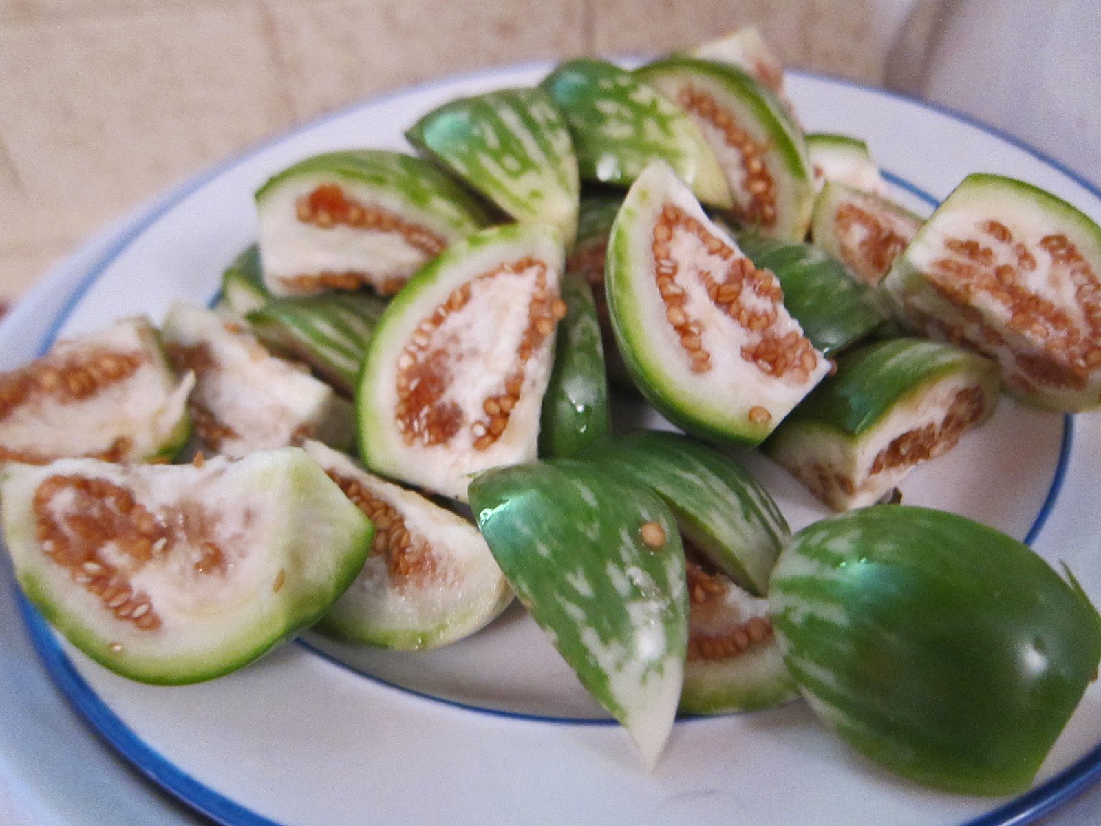 This is a recent favorite of the Missus. One day a couple of weeks ago I bought some of those golf ball sized green Thai eggplant. I thought we'd eat them raw with maybe a Thai Style Beef Salad, or something like that. The Missus on the other hand had a different idea….She wanted me to try and stir fry them with some shrimp, Thai style, in a sweet garlic type "sauce"….actually more of a coating as She didn't want these too wet. After making it a few times, I've finally got it down to the way the Missus enjoys it. It actually reminds me of those multi-part Chinese style stir-fries, which means it's the prep that really matters.
