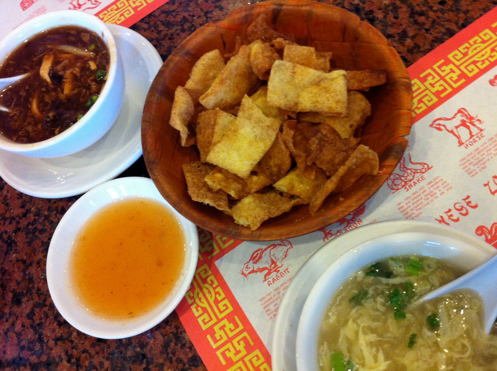 We both ordered lunch specials, which came with a choice of soup. Hot and Sour and Egg Drop were our choices. When we were first seated, the fried wonton strips and small plate serving of a sweet/vinegar 'duck' sauce were brought to the table.