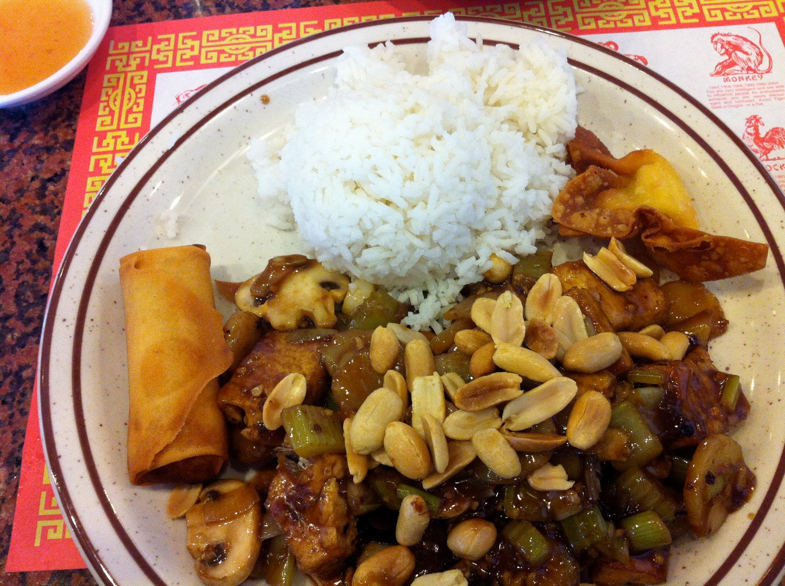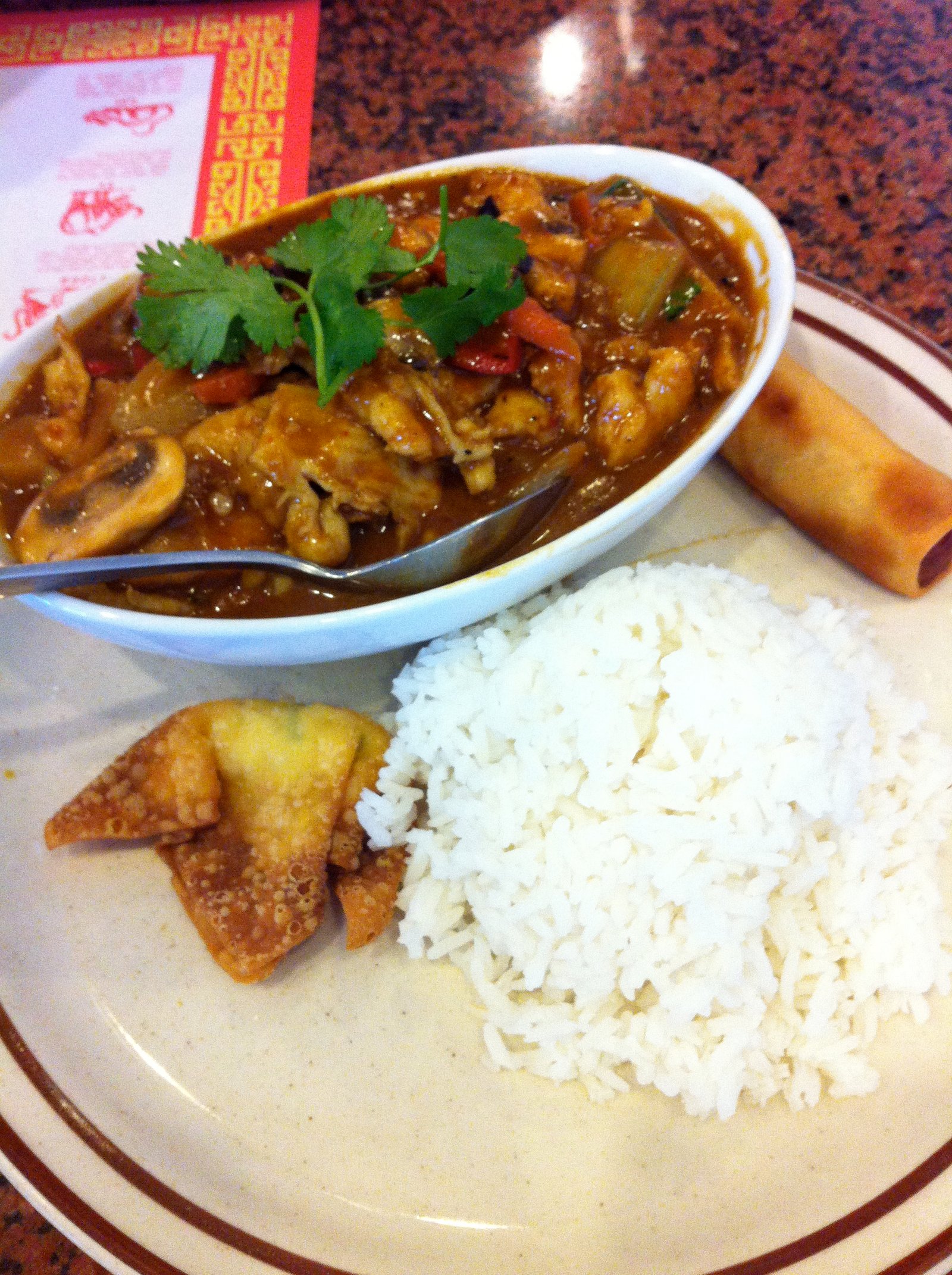 The Red Curry Chicken lunch plate ($7.55)- came with the soup, an egg roll (all vegetable), cream cheese fried wonton, steamed rice and a very good size serving of red curry chicken-made with fresh mushroom, red and green bell peppers and celery. Yes, celery, which was very complimentary with the flavors.