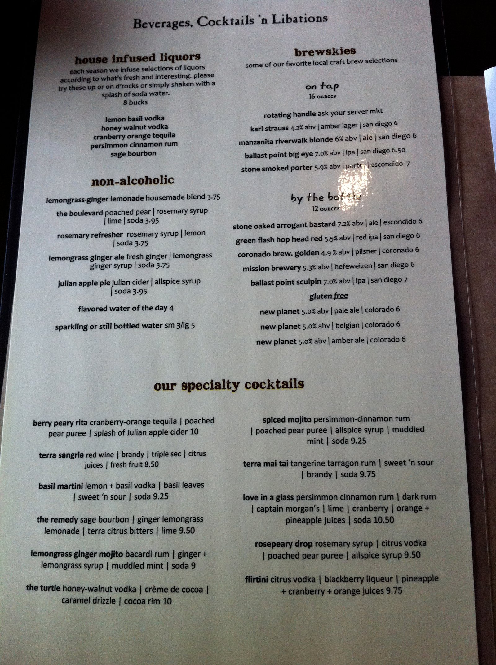 The Beverage Menu is on the opposite side of the regular menu. The fruit and herb-infused vodkas are made in house and I have heard only good things about the hand crafted non-alcoholic beverages.