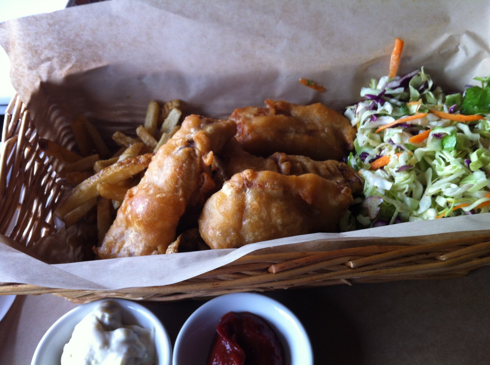 One of the lunch specials-Beer battered fresh local Ling Cod served with thin, crispy bistro fries and a really nice citrus slaw ($11). A house-made sort of tartar sauce made with lemon and capers was very complimentary to the fish (and its light, crispy batter). Of course the catsup was house made.