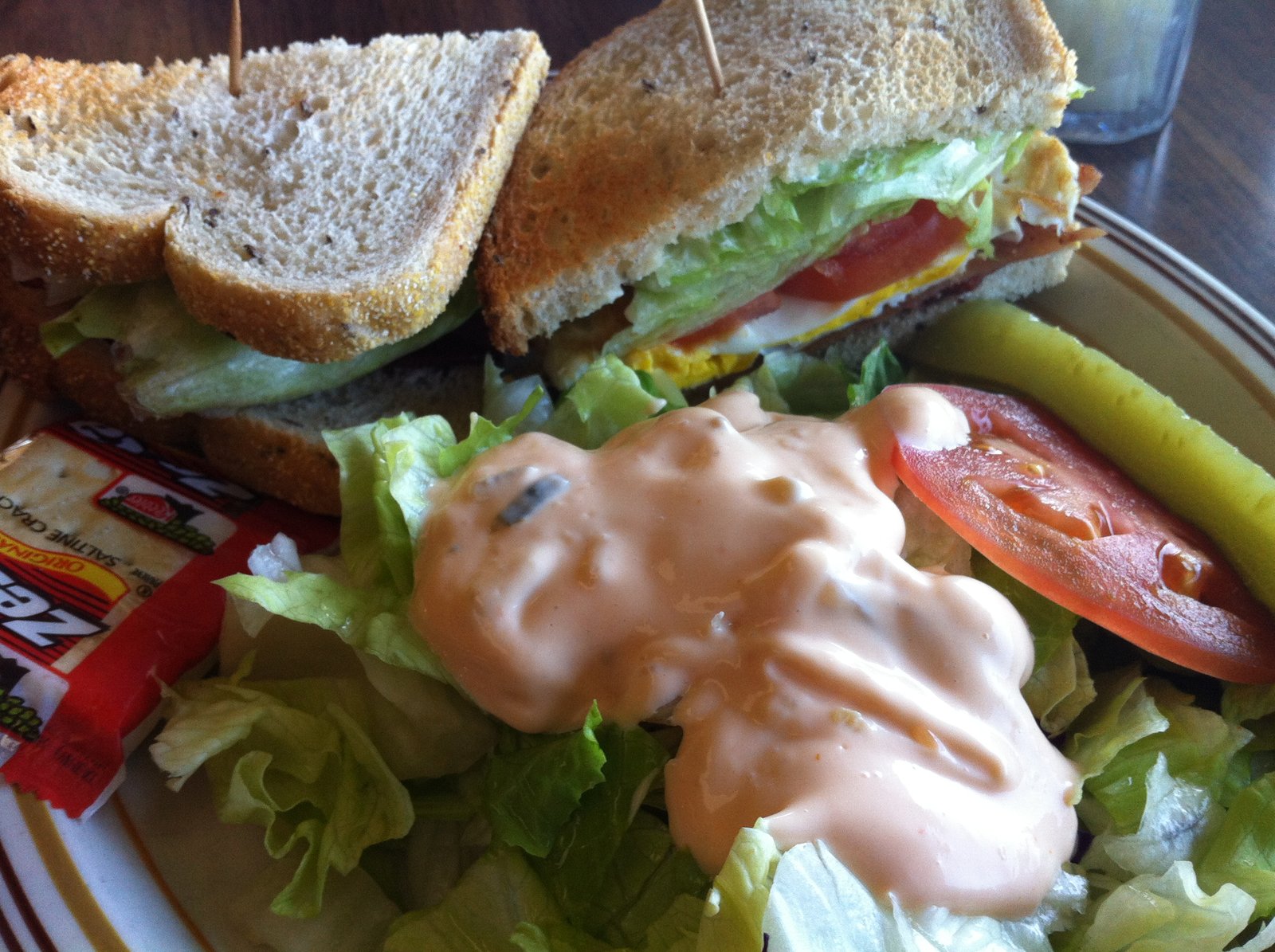 My order: BLT with egg ($6.25) on rye toast with my chosen side of a salad with Thousand Island dressing. Great sandwich, crispy bacon, fresh lettuce and tomato and a nicely fried egg. The salad was quite large and the salad dressing was very good.