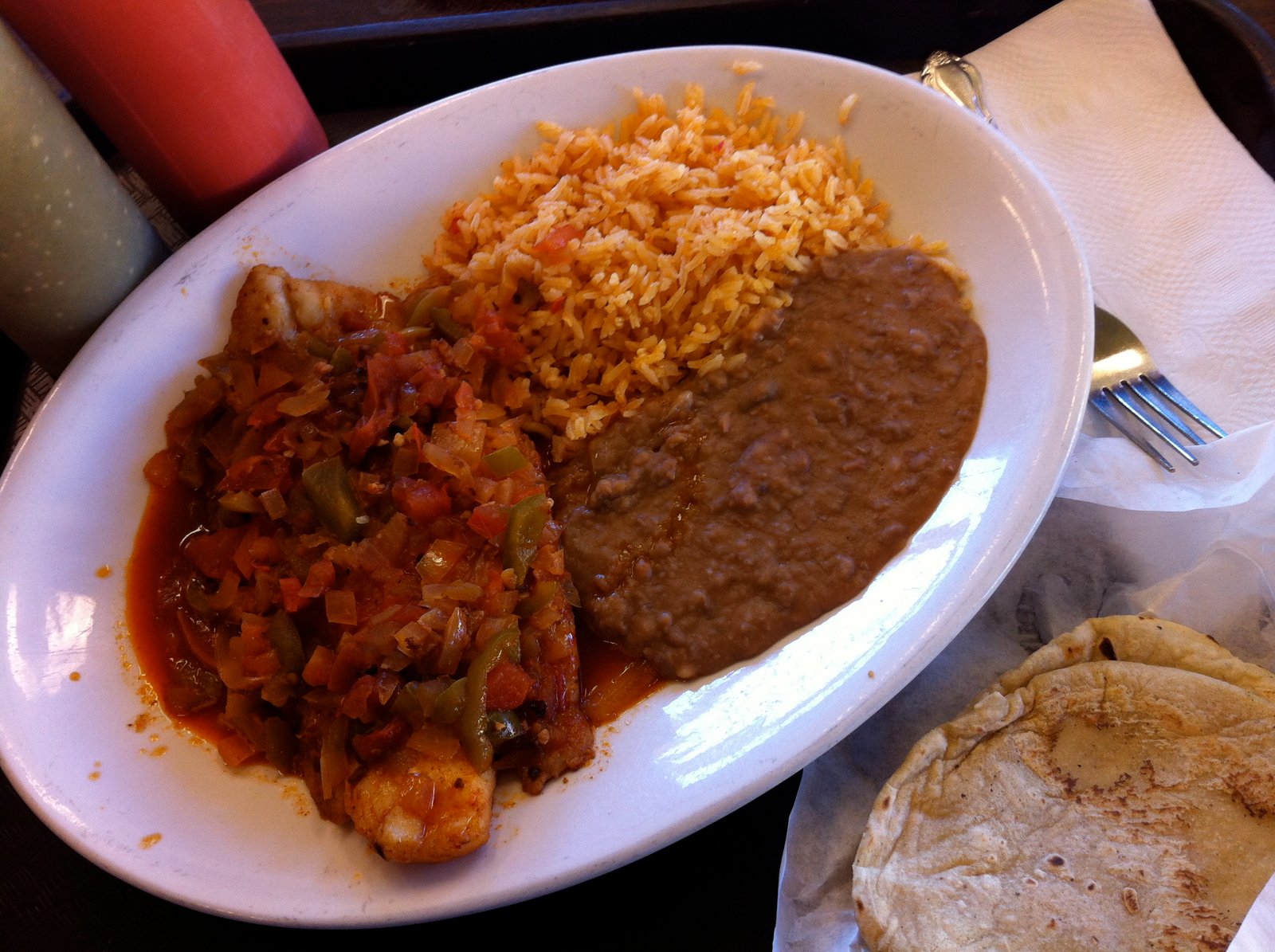I ordered a fish fillet with Ranchera sauce (Diablo sauce was another choice) ($8). This was a thick, large, fresh fillet (definitely not tilapia) covered with a very nice, very fresh chili/tomato/onion sauce that was unexpected. Served with a good rice, great beans, the two (also fresh and homemade) hot sauces shown and fresh, handmade corn tortillas.