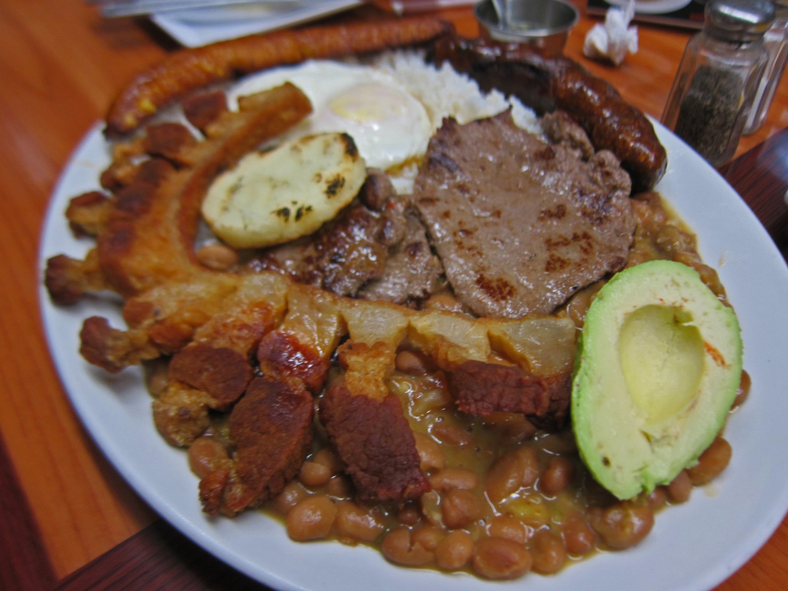 So the score on this one is four to three….four types of proteins….most of it deep fried; chorizo (Mexican), carne, chicharron, and the best item costilla….deep fried pork ribs. Three types of carbs; arepa (griddled corn cake), french fries (papas), and patacones; deep fried green plantains. In this case the green you see is really for presenation only and that tomato was carefully placed to distract you from thinking about all that other stuff.
